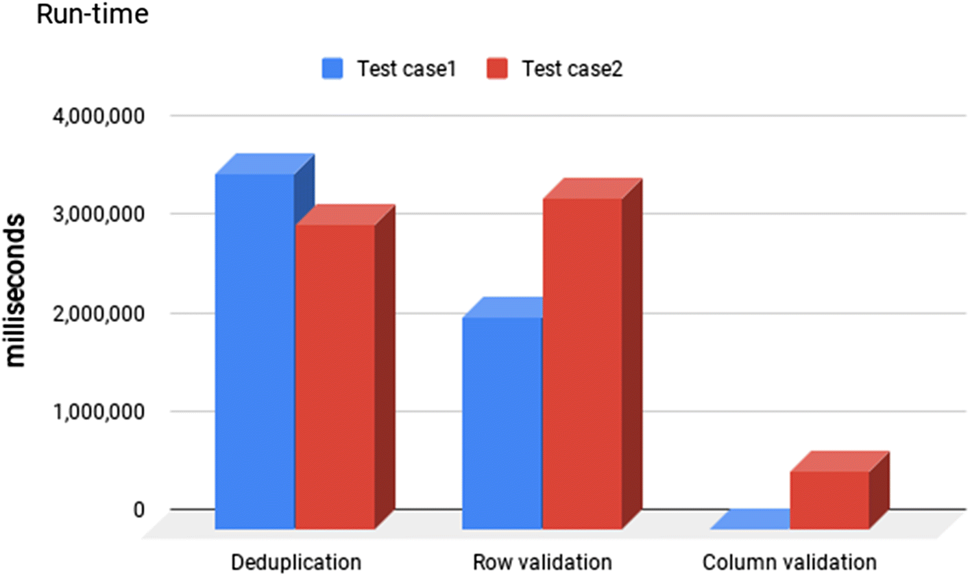 Moreover, by analysing and comparing the numbers in the two columns “First test case" and “Second test case", it can be noted that up to 80% of the time is devoted to the deduplication stage, plus creating and populating row delta tables in the row validation stage in order to detect whether any differences have occurred or not. The cost of those two operations comes from the fact that deduplicating a table means that all rows in the table are grouped on all columns using the Hive GROUP BY operator, while row validating two tables (A and B) means selecting all rows in A that are not in B and all rows in B that are not in A; row validation was implemented using the Hive full outer join operator. For further analysis, it is interesting to investigate whether the deduplication step can be optimized. The work of Chu et al. should be considered [40].