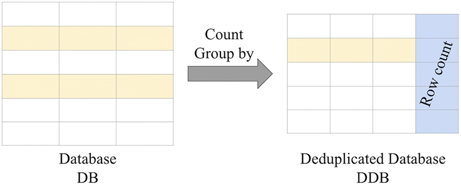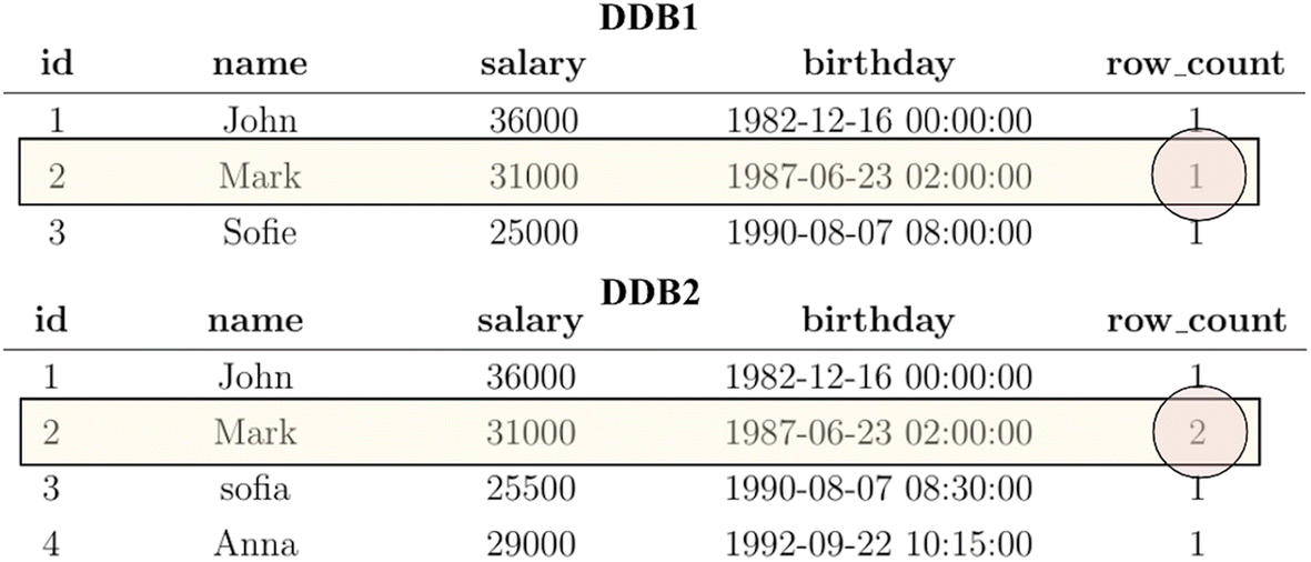 After the deduplication step, two new databases are created. Each database contains the same tables and data as the original databases before deduplication, but with one additional column “row_count" that shows the number of times each row appears in a table. Table 2 displays the schema of the databases “DDB1" and “DDB2"—deduplicated copies of “DB1" and “DB2" respectively—while Fig. 6 shows their data.
