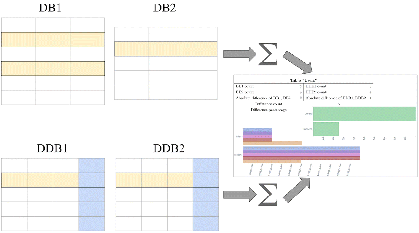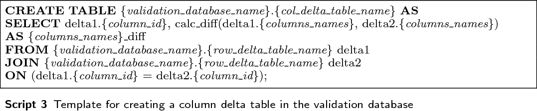 Row statistics (7): To calculate the total number of differences in the data of each table in “DDB1" and “DDB2", there is a need to compare the values in each row and detect any potential changes. Those differences and changes are referred to as the “delta" values. The differences are stored in row delta tables that help in generating the related statistics at a later step in this validation stage. The chosen method to store the delta tables is to create a new database that is used for both row and column validation stages.