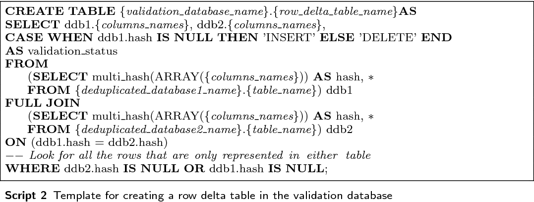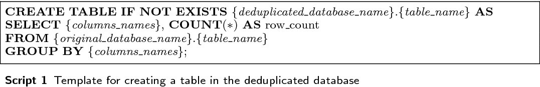 The implementation steps for the deduplication stage are as follows. First, a deduplicated database instance is created by extracting all “CREATE TABLE" statements from DB1 and DB2. Each table is extended with an additional column called “row_count" as displayed in Script 1. By using COUNT and GROUP BY in this script, all duplicates in the original database are represented in the new deduplicated database using only one row with the extra column “row_count".