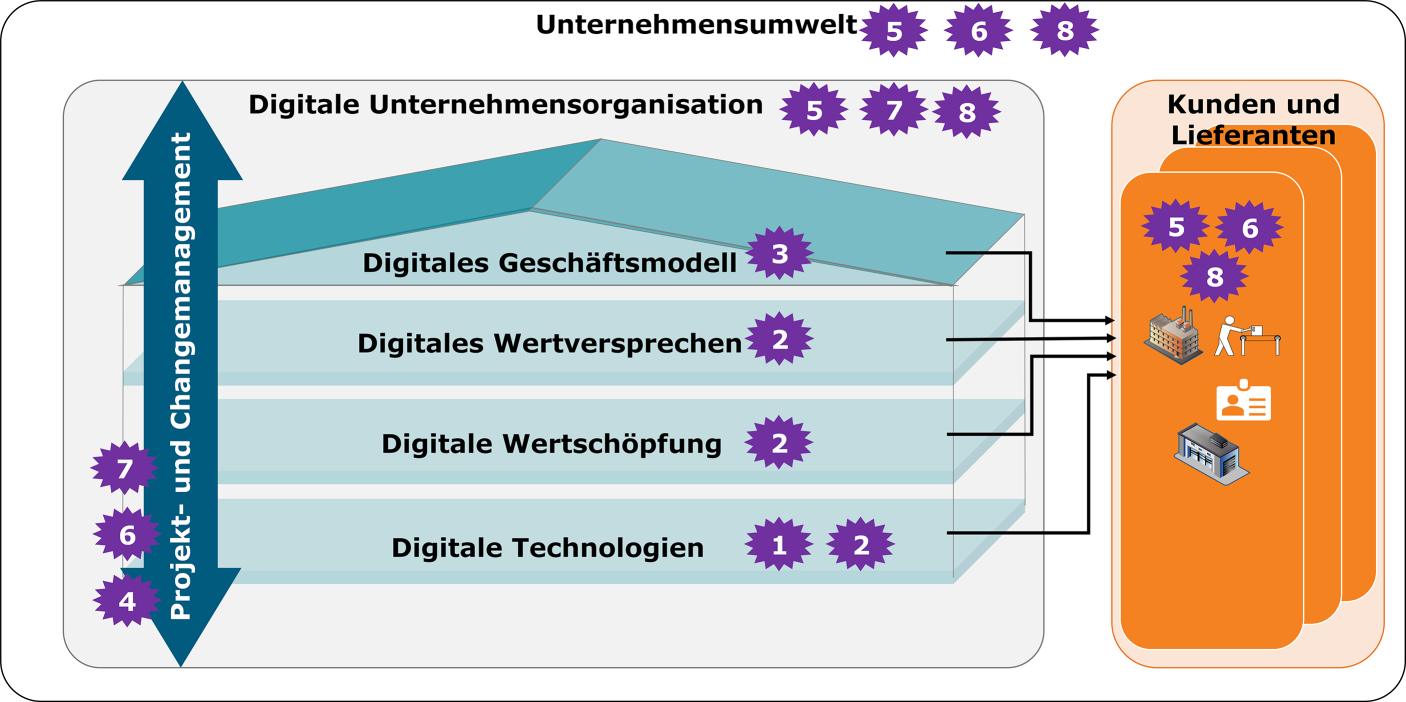 Um auf globalen Märkten wettbewerbsfähig zu bleiben, müssen sich nahezu alle Unternehmen mit den Herausforderungen der Digitalisierung und der Digitalen Transformation auseinandersetzen. Die davon betroffenen Bereiche sind vielfältig und reichen von der Implementierung von Enterprise Resource Planning (ERP)-Systemen für eine umfassende Geschäftsunterstützung und -planung über die gesamte Organisation hinweg bis hin zur Entwicklung komplexer Wertschöpfungsnetzwerke, die klassische horizontale Wertschöpfungsketten erweitern. Die Digitalisierung eröffnet zahlreiche Möglichkeiten, Geschäftsabläufe zu automatisieren, Transaktionskosten zu reduzieren und die Flexibilität im Kunden- und Partnermanagement zu erhöhen. Eine besondere Herausforderung für Unternehmen besteht darin, digitale Elemente effektiv in bestehende Geschäftsstrukturen zu integrieren und somit die Prozesse oder das gesamte Geschäftsmodell zu optimieren und zu erweitern. Ein tiefes Verständnis für Kommunikationstechnologien und digitale Innovationen ist für Unternehmen in der heutigen dynamischen Geschäftswelt unerlässlich. Die Digitalisierung treibt kontinuierliche Veränderungen und Anpassungen voran. Globale digitale Vernetzung, Automatisierung von Geschäftsprozessen und die Umstrukturierung von Geschäftsmodellen sind beispielhafte Auswirkungen der Digitalisierung, die Unternehmen vor die Herausforderung stellen, diese Entwicklungen sowohl als Chance als auch als Risiko zu bewerten und entsprechend zu agieren (BVMW 2023; Pagani 2013; Schlick et al. 2014; Leyh et al. 2018, 2017; Mathrani et al. 2013).