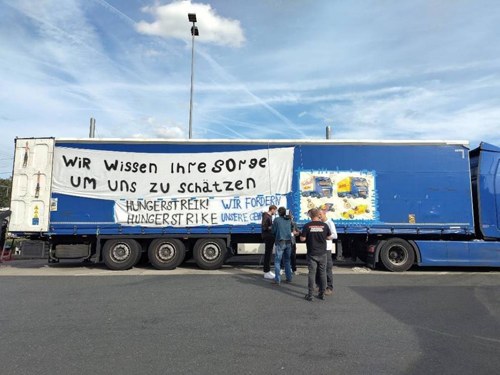 Der zweite der beiden Streiks erhielt nicht nur durch einen Hungerstreik, in den einige der Fahrer traten (s. Abb. 3), öffentliche Aufmerksamkeit, sondern auch durch seinen Bezug zum 2023 eingeführten Lieferkettensorgfaltspflichtengesetz (LkSG). Gräfenhausen gilt als einer der ersten Anwendungsfälle des LkSG in der Logistik und hat im Nachgang auch vermehrte Aufmerksamkeit auf die Transportvermittlung via digitaler Frachtenbörsen und die damit verbundenen sozialen Risiken gelenkt (Loew 2023; Helwing-Hentschel et al. 2024). Die Proteste haben darüber hinaus verdeutlicht, dass durch die stark fragmentierten Belegschaften und den geringen gewerkschaftlichen Organisierungsgrad von Lkw-Fahrenden insgesamt eine relativ geringe Verhandlungsmacht der Beschäftigten besteht – auch in plattformbezogenen Arbeitskontexten. Gleichzeitig wurde auch deutlich, dass digitale Kommunikationsplattformen für die Organisation und Solidarisierung mit dem Protest eine wichtige Rolle gespielt haben. Via „X“ wurde z. B. eine Solidaritätsaktion südkoreanischer Lkw-Fahrenden mit den Protestierenden in Gräfenhausen geteilt.