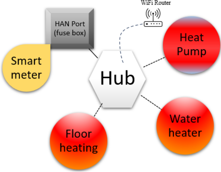 A simplified illustration of a standard hub connection. The SET hub also requires a smart meter and a connection to the internet (WiFi). The connection to the HAN port enables reading real-time power consumption data from the smart meter