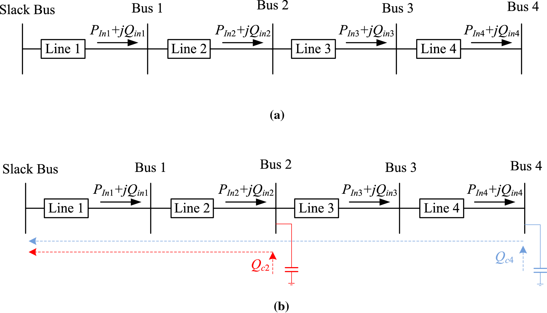 An analytical expression is proposed here to directly compute CR after installing multiple capacitors at specified set of locations in a distribution system. Normally, in passive distribution systems, the active and reactive powers flow in one direction from slack bus to load buses, as shown in Fig. 1a, where a 5-bus system is considered. However, if two capacitors are installed at buses 2 and 4 (Fig. 1b), the reactive power flow through some lines will be influenced by their reactive power injections. This injected reactive power for each capacitor will affect only the power flow through its upstream lines. For example in Fig. 1b, all lines are affected by \(Q_{c4}\), while only lines 1 and 2 will be affected by \(Q_{c2}\). This implies that the impact of a capacitor on the system lines varies depending on its location (i.e., bus). On other words, for each capacitor, there are some lines whose reactive power flows are affected by. CF at the base case, i.e., without capacitors \((\mathrm{CF}_{wo/c})\), can be written as follows: