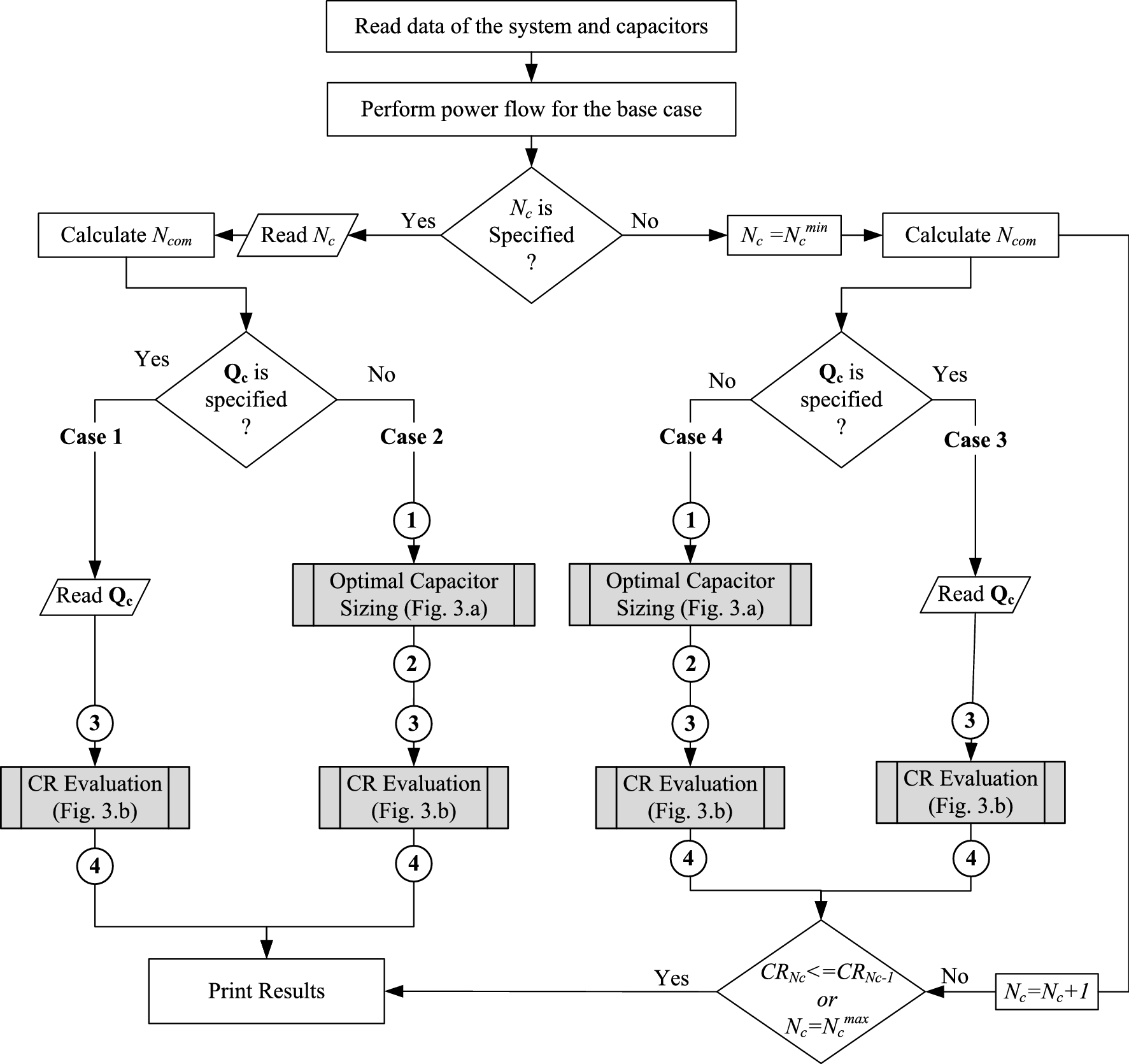 Figure 2 shows a flowchart of the proposed method with considering the aforementioned four cases. Note that the shaded blocks in this figure represent two subroutines described in Fig. 3. The first subroutine (optimal capacitor sizing) aims at calculating the optimal sizes of capacitors (from \(\textcircled 1\) to \(\textcircled 2\)). The second subroutine (CR evaluation) estimates CR values for all combinations and gets the optimal combination (from \(\textcircled 3\) to \(\textcircled 4)\). For Cases 1 and 2, these subroutines are solved once. However, for the other two cases, these subroutines are repeated according to the acceptable range for the number of capacitors (\(N_\mathrm{c}^{\mathrm{max}}<N_\mathrm{c}<N_\mathrm{c}^{\mathrm{min}}\)). The process of optimal capacitor numbering starts with allocating \(N_\mathrm{c}^{\mathrm{min}}\) capacitors, as shown in Fig. 2. The stopping criteria of this process are satisfied if \({\mathrm{CR}_{N_\mathrm{c}} <= \mathrm{CR}_{N_\mathrm{c}-1}}\) or \(N_\mathrm{c}=N_\mathrm{c}^{\mathrm{max}}\). In this paper, we will focus on testing Case 4 in which all of the three variables (capacitor number, locations, and sizes) are required to be optimally computed. It is important to note that the proposed method provides a direct optimal solution for all the cases with using the power flow results of the base case. The proposed mathematical formulation is general, and therefore, it facilitates any extension raised by power utilities or system operators/planners with respect to the integration of capacitors.
