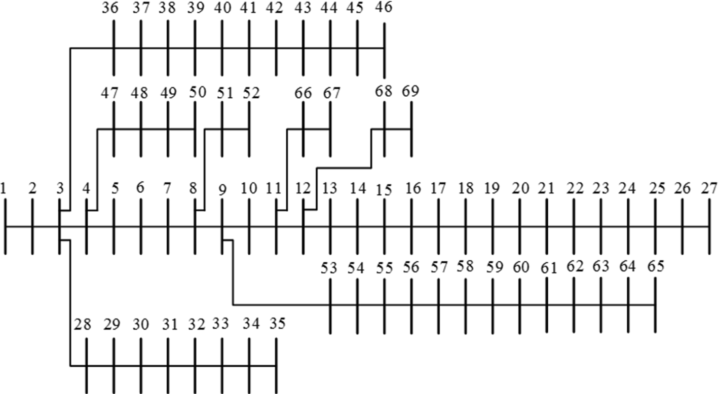 The proposed method is applied on the 69-bus distribution system, which is widely used as a test system for installing capacitors. Figure 4 shows the test system where its data that involve complete distribution line parameters and active and reactive load power are given in [18]. Bus 1 is the slack bus, while all other buses are valid for capacitor installation. In the simulation results, the parameters of CF are set as follows: \(K_p = 0.06\)$/kW, \(K_{ci} = 300\) $/year for each i location, \(K_\mathrm{Ins}=1000\)$ for each location, and \(T = 8760\) [29]. The annual total cost of the test system at the base case \((\mathrm{CF}_wo/c)\) is 118,260$. The proposed method has been implemented in C++ programming environment. In the following subsections, the proposed method is validated with an exact search method that exhaustively determines the optimal solution. The proposed method is also compared with existing methods to demonstrate its effectiveness.