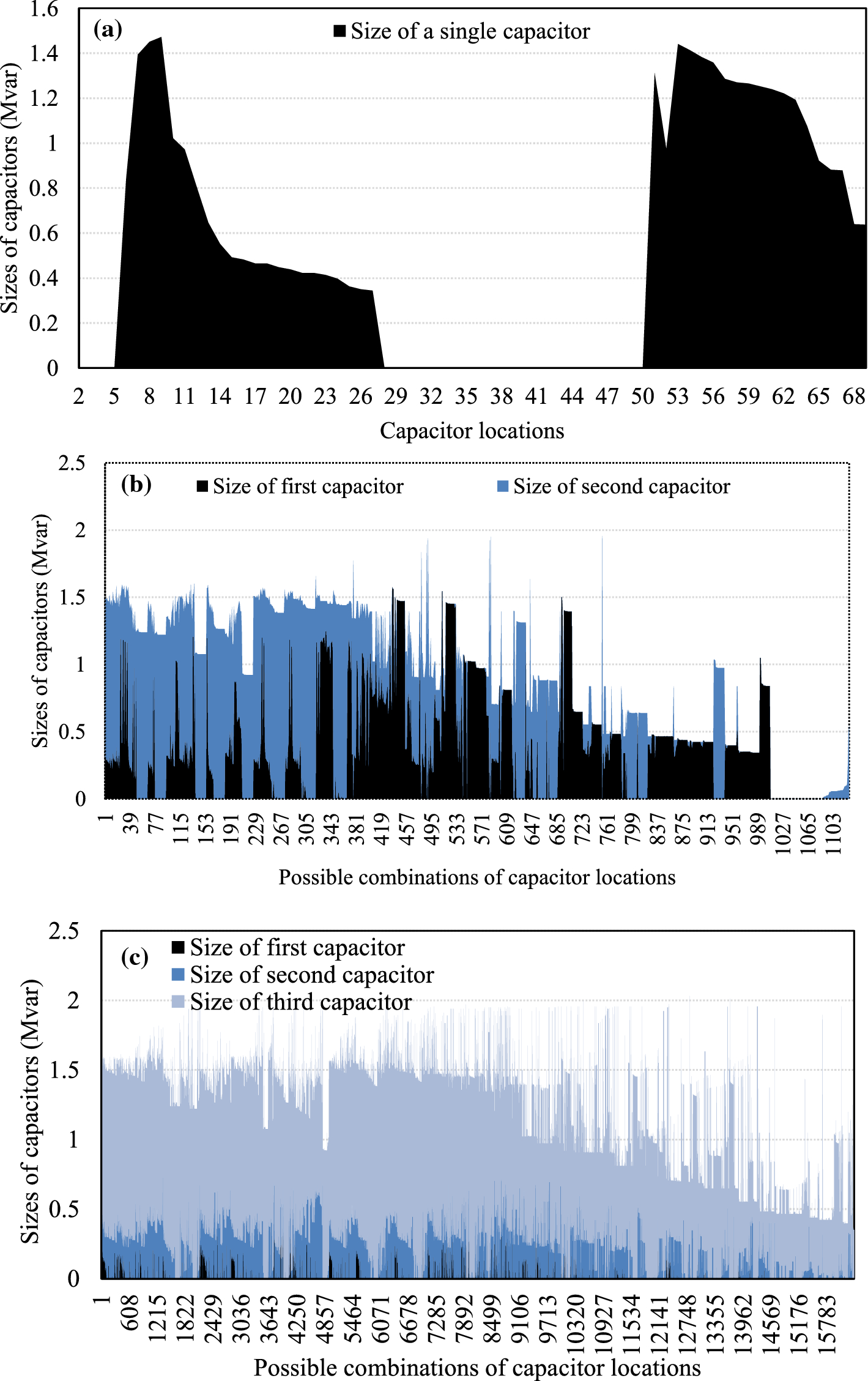 Computed optimal capacitor sizes at all possible combinations of locations for the 69-bus system: a single capacitor, b two capacitors, and c three capacitors