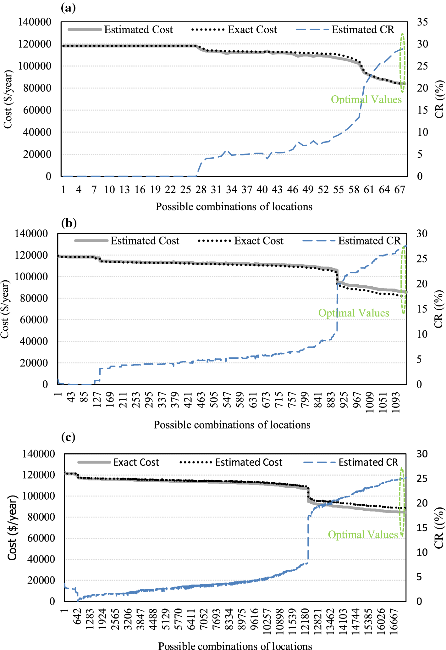 Exact total costs, estimated total costs, and estimated CR for all location combinations for the 69-bus system: a single capacitor, b two capacitors, and c three capacitors