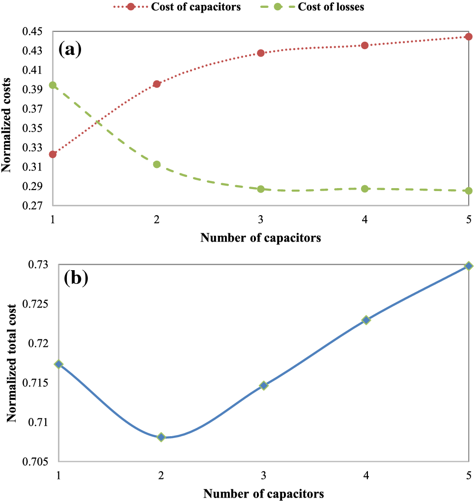In this subsection, we demonstrate the efficiency of the proposed method for determining the optimal number, locations, and sizes of capacitors so as to minimize the total costs. Specifically, the proposed method is applied to solve the capacitor allocation problem with considering a maximum capacitor number of 5. The calculated results for different numbers of capacitor are tabulated in Table 1. In general, the total costs with the all capacitor numbers are greatly reduced compared with that of the base case. For example, the total costs for 1, 2, 3, 4, 5 capacitors are 84,803, 83,706, 84,480, 85,463, 86,274$/year, respectively, which are much lower than of the base case (118,260$/year). The costs of capacitors, the cost of losses, and the total costs are normalized with respect to the total cost in the base case, and their variations are plotted against the number of capacitors (Fig. 7). It can be noticed that curves of capacitor and loss costs are contradictory in nature; therefore, ignoring any of them can lead to improper installation of these units, as shown in Fig. 7a. Figure 7b shows the total system cost which has a U-shape pattern . In other words, the total cost is initially reduced till a certain optimal capacitor size at which the total cost is increased. As shown in the figure, the optimal number is two capacitors, whereas the total cost is reduced to be only 83,706$/year. This trend demonstrates that increasing the number of capacitors cannot guarantee lower costs. For this reason, determining the optimal number, locations, and capacities of capacitors in a simultaneous manner as accomplished by the proposed method can yield economic benefits, i.e., minimum costs.
