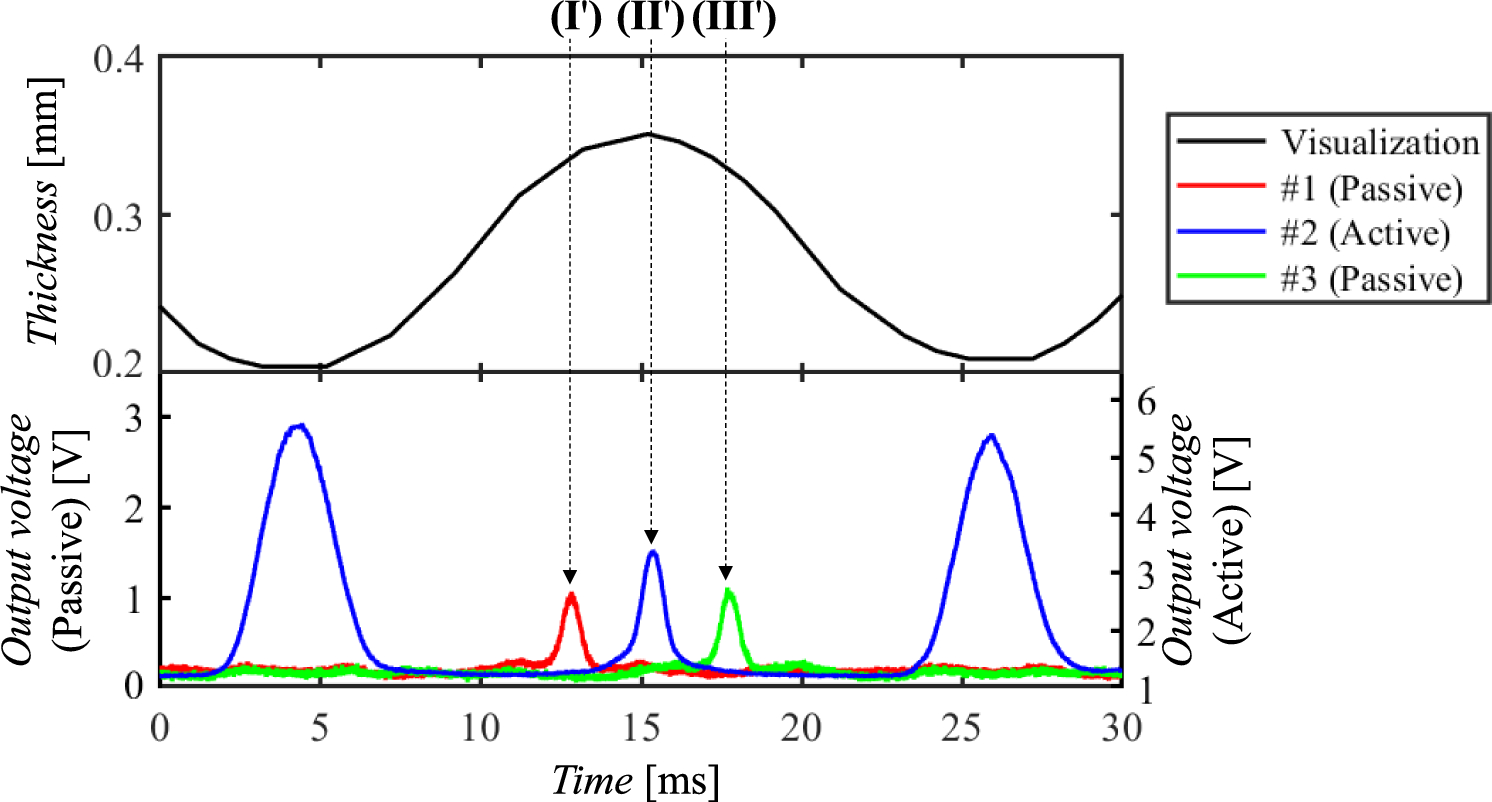 Time-series thickness obtained by visualization and output signal delivered from the OWF. Note that the visualization result is the time-series change in the distance between the test specimen and OWF surface directly above channel #2. Based on the analysis, the peaks at times (I′) to (III′) correspond to those at times (I) to (III) in Fig. 5
