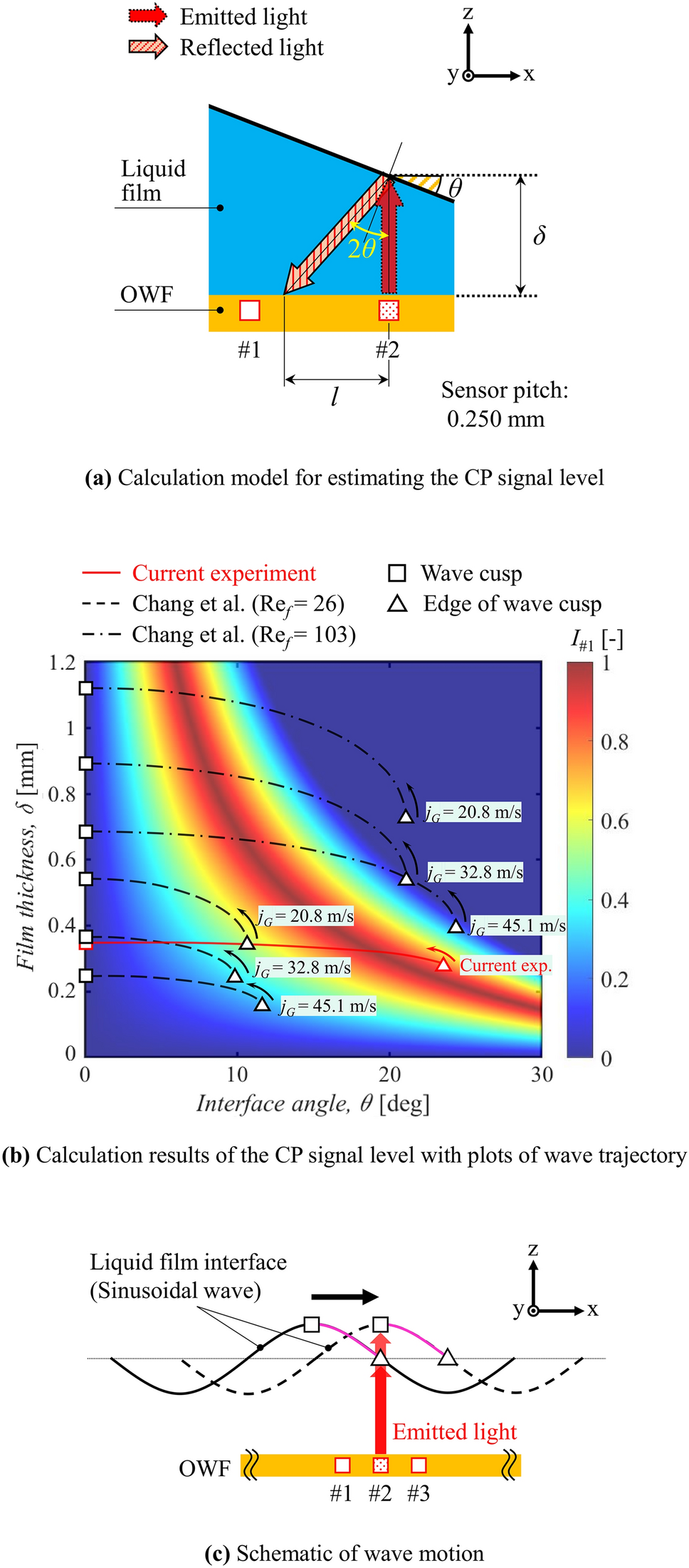 where Δs is the sensor pitch (0 < l ≤ 2Δs, Δs = 0.250 mm in this study). I#1 distributes shown in Fig. 11b as a function of δ and θ (0 < δ < 1.2 mm and 0 < θ < 30°). The trends of δ and θ, calculated based on the experimental conditions in Table 2, are plotted as a red solid line. The other conditions (Chang et al. 2019, 2023) are also shown as black dashed lines for reference. The calculated range corresponds to the passage of the cusp’s ascending limb, as depicted in Fig. 11c. For details of the calculation, please see Appendix A. According to the current experimental conditions (red solid line), I#1 increases from the edge of the wave cusp (white triangle), reaches a maximum value, and then decreases to the wave cusp (white square). That is, the output signal of #1 is estimated to peak just before the cusp passes over channel #2. In contrast, the output signal of #3 should peak just after the cusp passes. These trends agree with the actual signal in Fig. 10. It should be noted that the above trends significantly depend on Δs. According to other results, the overall levels of I#1 become small at low liquid superficial velocity (Ref = 26) when Δs = 0.250 mm, and it might be difficult to find the CP signal. Nevertheless, our interest is to find the disturbance wave that frequently emerges at a relatively large liquid flow rate. For Ref > 100, the estimated signals of #1 are similar to that of the current experiment; therefore, we will undoubtedly find the cusp passage based on the appearance of the CP signal. We further emphasize that our experiment proved the cusp detection for thinner liquid film conditions than conventional literature, which makes it challenging to receive a clear CP signal.