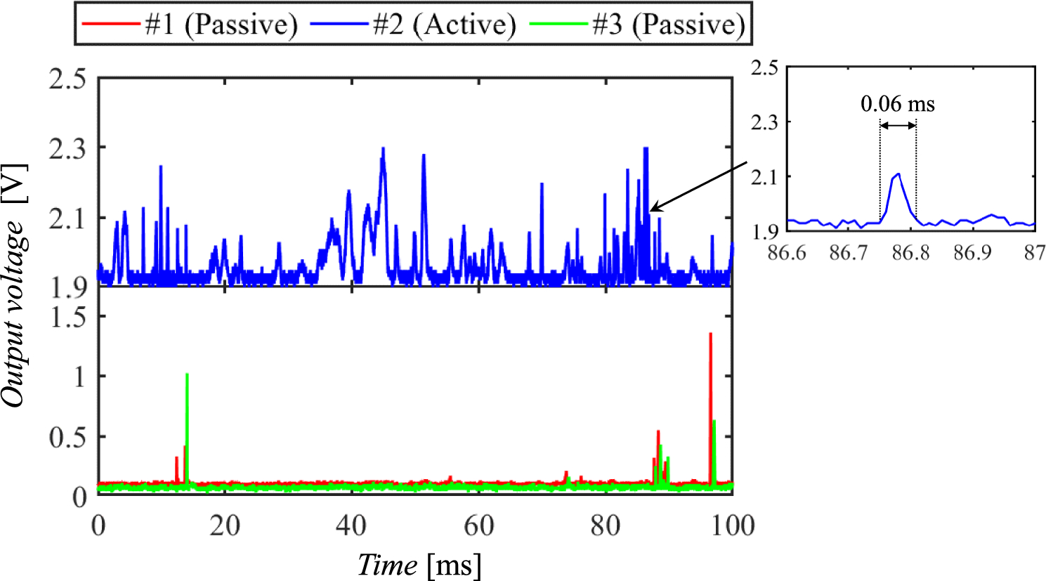 As a typical example of the output signal, the OWF signal obtained at jG = 20 m/s is shown in Fig. 12. There are numerous peak-like signal changes in #2, indicating that channel #2 constantly measures thickness fluctuations. In contrast, the CP signals are infrequent, as the actual waves are not necessarily two-dimensional waves like in the experiment on pseudo-film flow measurement, and the cusps do not always pass in a straight line over the sensor array. We emphasize that the OWF measurements successfully obtained the output signals without temporal leakage. The measurement methods for the few-dozens-kHz band are unable to detect rapid thickness fluctuations, such as those shown in the inset.