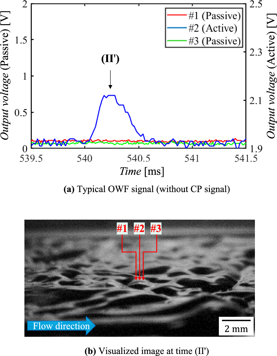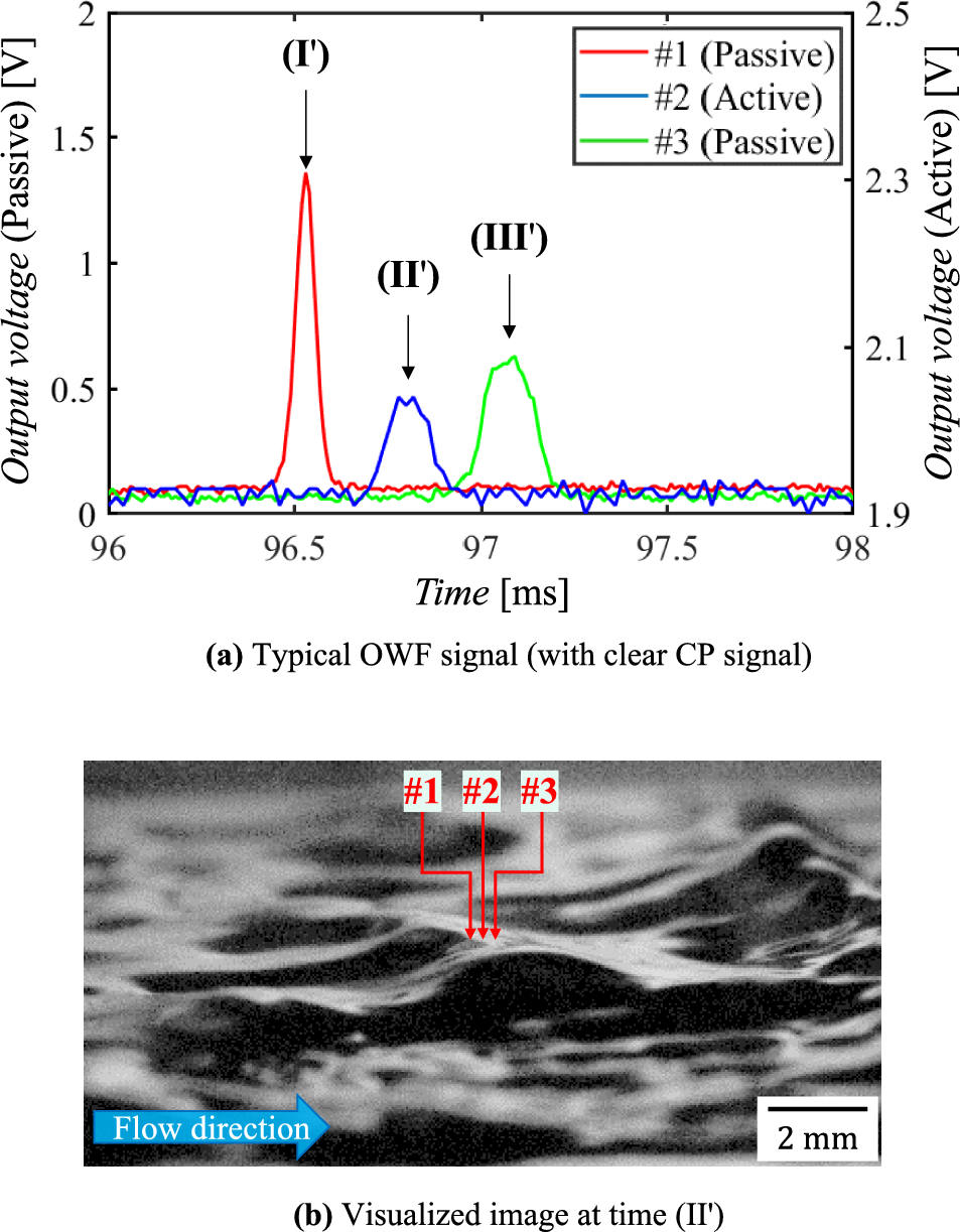 A temporally magnified signal and visualization result are provided in Fig. 13, in which the CP signals clearly appear in both #1 and #3. The red arrows in the image represent the positions of channels #1 to #3. As shown in the figure’s panel (a), the signal peaks at times (I’) to (III’) appear in the order of #1, #2, and #3, and it can thus be estimated that the wave cusp passes over the sensors as shown in Fig. 5. This situation is in good agreement with that illustrated in Fig. 13b. This correspondence was observed in almost all cases where relatively large-amplitude waves existed over the sensor array. However, in Fig. 14, no CP signals exist in #1 and #3, although the cusp passage over the sensor arrays is visualized. According to Fig. 11b, the CP signal inevitably decreases in small-amplitude waves with a thin thickness and slight curvature. The visualized image exactly shows the detection of such a small wave. As we concluded from the model analysis, the CP signal indicates the passage of cusps with a relatively large amplitude, even in the actual wavy film flow.