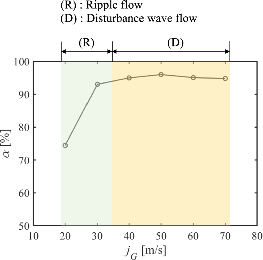 where NAll is the total number of CP signals detected in the measurement time, and n is the number of patterns in which the CP signal level values differ between #1 and #3 in the measurement time. The colored area indicates the flow regimes, i.e., ripple flow and disturbance wave flow, based on the conventional classification (Fukano 1998). The transition from ripple flow to disturbance wave flow, marked by a significant increase in the asymmetry of the cusp shape, is a key point of interest due to the shear stress from a large jG (Berna et al. 2014). Figure 15 reveals a clear trend: as jG increases, α also increases, reaching a near-constant value after jG = 40 m/s. This transition is consistent with the flow regimes predicted by the existing literature, indicating that the cusp shape becomes increasingly asymmetric with increasing jG. It should be noted that all liquid film flow classifications were derived from researchers’ observations with transparent channels. However, by utilizing the CP signal, we can directly identify the passage of the wave cusps and their shape information from only the OWF signals, even in closed environments under unknown conditions.