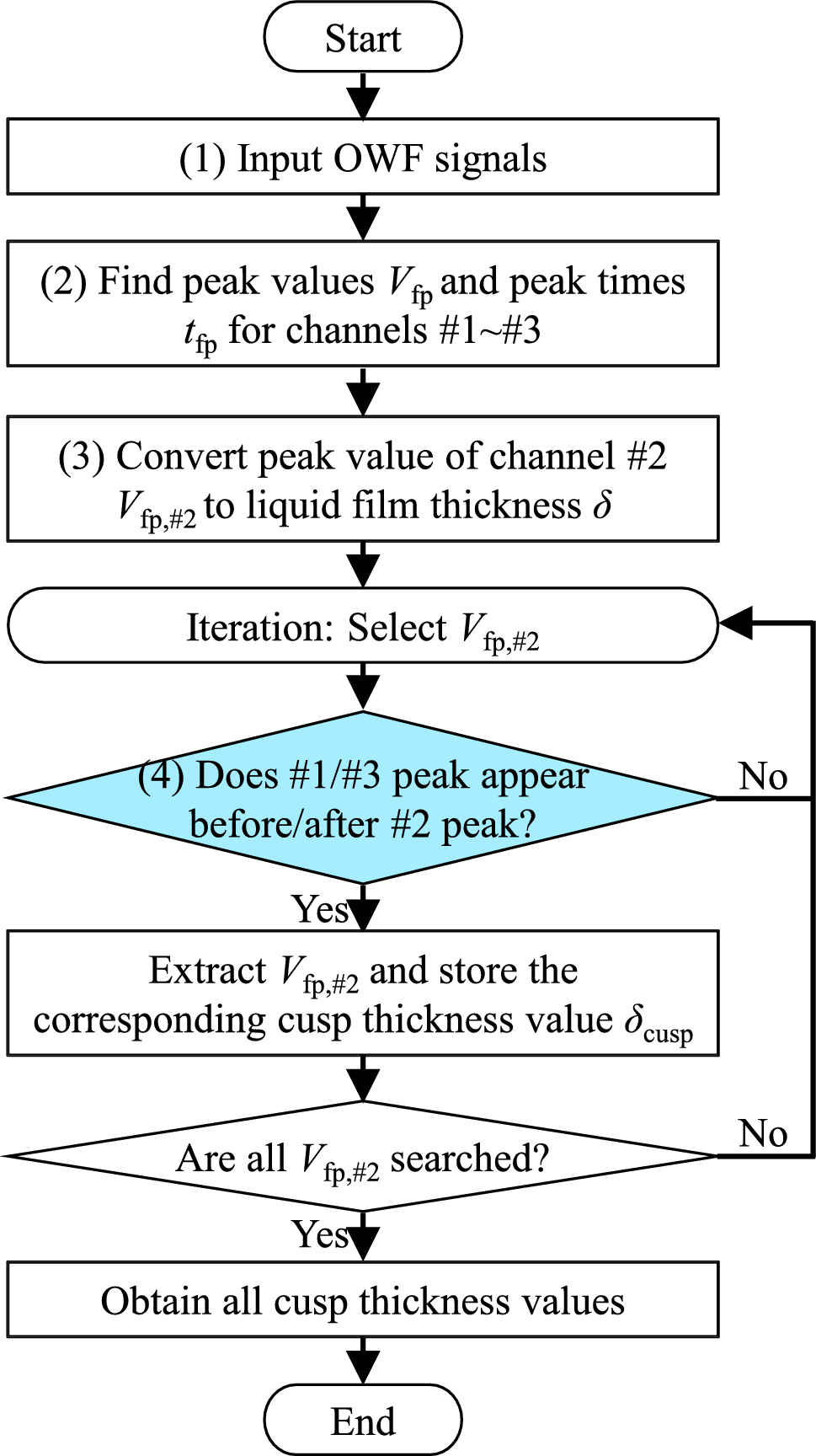We establish a signal processing for wave-cusp extraction through array sensing of the OWF. Figure 16 is a flowchart of our new signal processing method by the OWF. Steps (1) to (3) are the same as those used in conventional signal processing methods (Furuichi et al. 2023a). In Step (1), all the acquired data of the output signal from the OWF are input. In step (2), the peaks of the output signals of all channels are detected. In step (3), all the peak values Vfp,#2 of channel #2 are converted into liquid film thickness δ according to the calibration curve. Note that δ is a mixture of the film thickness values of the cusps and troughs of interfacial waves. The appearance of the CP signal corresponds to the passage of the cusp with large amplitudes over the sensor array in Sect. 4.2.1. Therefore, we added step (4) to extract the cusp thickness. For details of the signal processing algorithm, please see Appendix B.