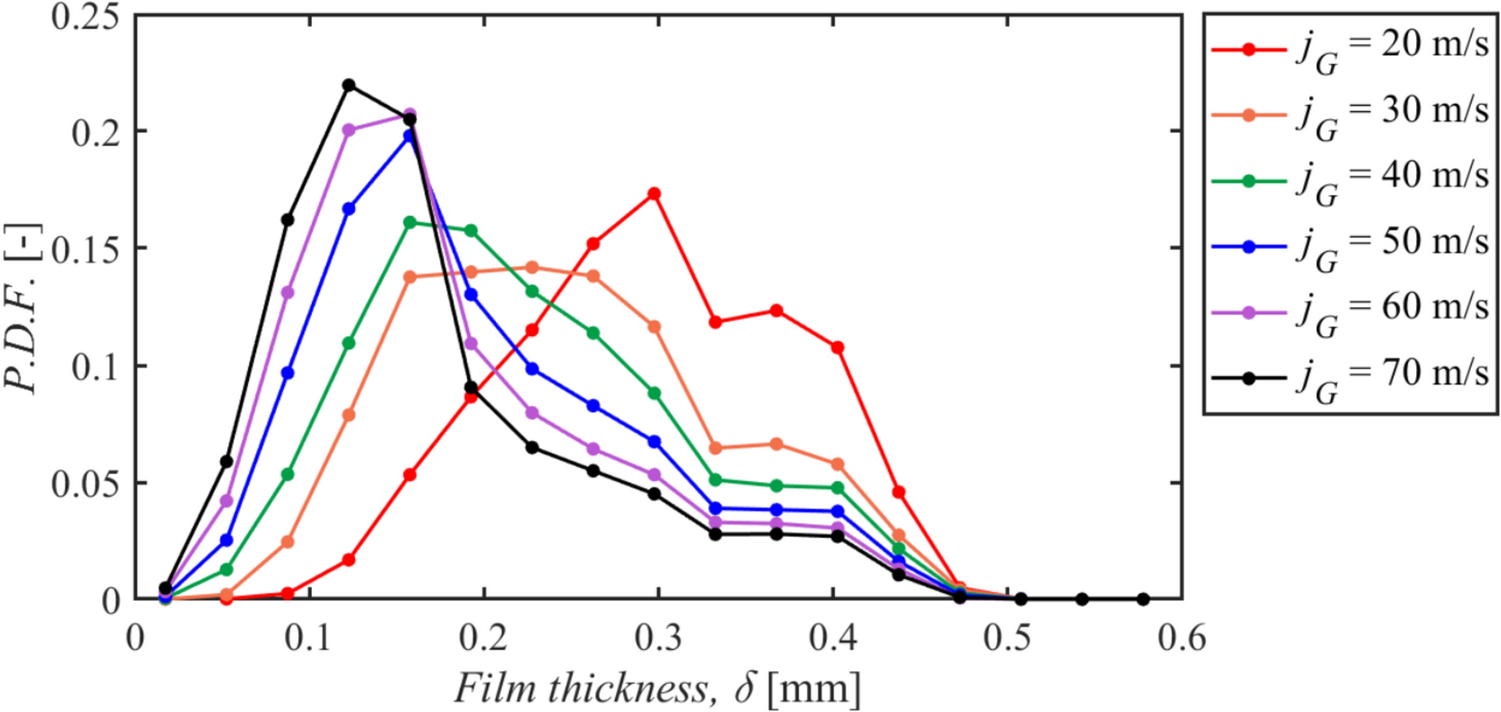 Figure 17 provides the probability density functions (PDF) of all liquid film thicknesses obtained in step (3). As jG increases, the profile of each PDF changes noticeably: the distribution becomes less symmetrical as jG approaches 30–40 m/s and appears to resemble a log-normal distribution. This jG range corresponds to the transition regime from rippled flow to disturbance wave flow, as shown in Fig. 15. These distributions and their trends are common patterns; however, we emphasize once again that the OWF successfully obtained them without temporal leakage, thanks to its 100 kHz resolution.