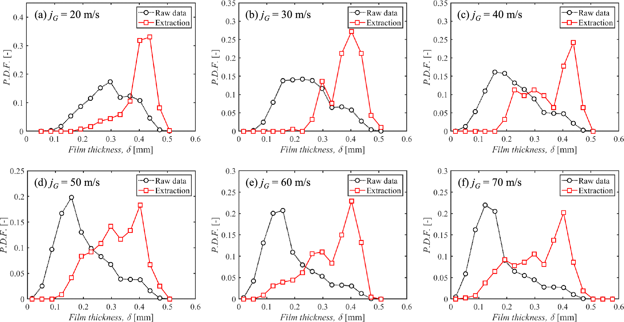 Figure 18 shows the overlaid PDF before and after step (4). The black line in Fig. 18 represents the raw data of all film thicknesses (identical to Fig. 17), whereas the red line represents the extracted cusp thickness. The relatively large thickness, including the disturbance wave, is clearly extracted under every condition, and we can also clearly find their dominant mode values. Moreover, it is notable that the distributions deviate from a unimodal distribution, particularly when jG > 30 to 40 m/s. The extracted distribution consists of both the large waves and the accompanying ripple waves, as illustrated in Fig. 1, which is nothing but a characteristic of the disturbance wave flow. These results prove that the cusp thicknesses of the principal component in the wavy interface can be extracted from the original OWF signals using the newly established algorithm.