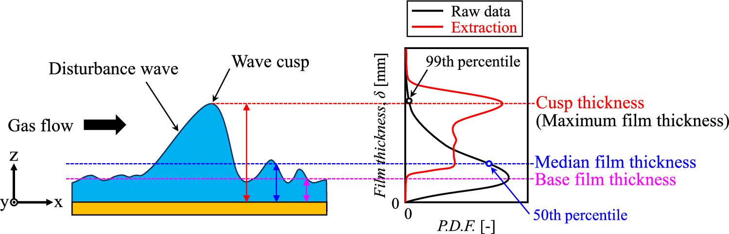 Major thickness levels analyzed in this study and their corresponding probability density functions of liquid film thicknesses. This schematic diagram depicts the typical relationship between interface structure and film thickness distribution in disturbance wave flow