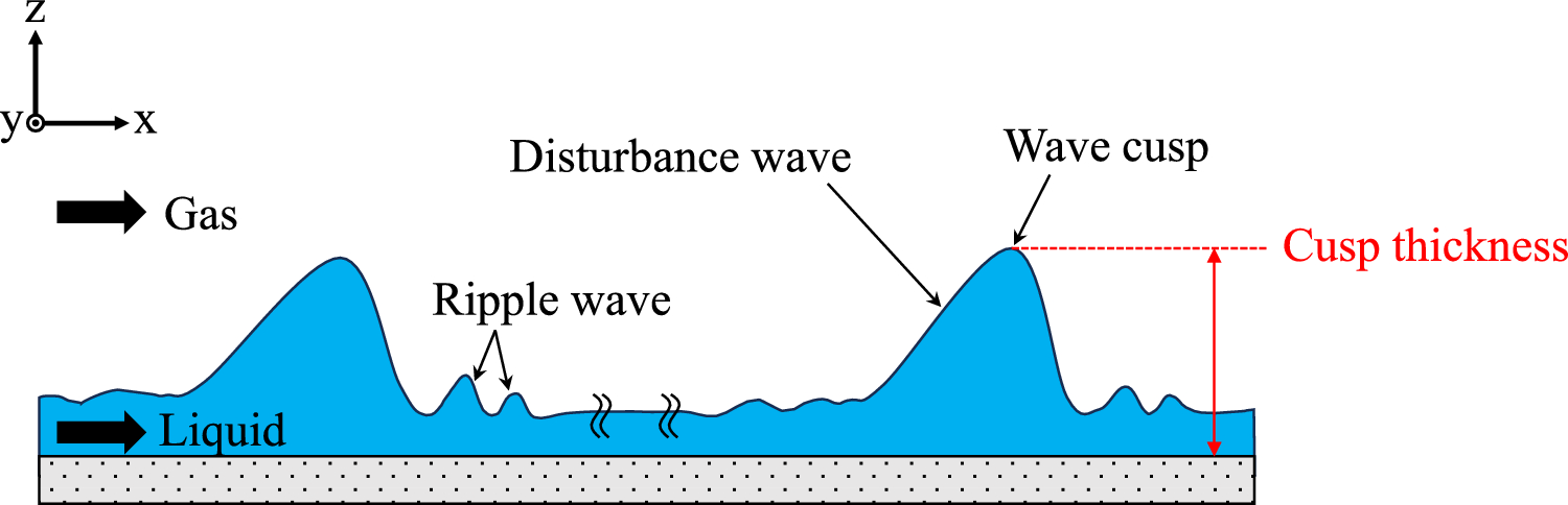 Liquid film flow that ranges in thickness from a few hundred microns occurs in a wide range of industries, e.g., fuel rods in boiling water reactors (Nishida et al. 1994; Kawahara et al. 2015; Robers et al. 2021), stator and rotor blades in steam turbines (Hammitt et al. 1981; Simon et al. 2016; Gribin et al. 2020), cleaning and drying wafer processes in semiconductor manufacturing (Staudegger et al. 2009; Kobayashi and Abe 2013), falling film absorbers (Killion and Garimella 2001; Mortazavi et al. 2015), falling film evaporators (Yung et al. 1980; Fernández-Seara and Pardiñas 2014), and ice accretion on aircraft wings (Fortin et al. 2006; Liu and Hu 2018). These thin liquid film flows are often accompanied by complex interfacial waves spatially and temporally multiscale depending on the gas and liquid flow conditions (Inoue and Maeda 2021). Such waves include those that behave in a solitary manner, others coalesce, and others link in axial and transverse directions, creating 2D/3D wave crests, referred to as “cusps,” throughout the liquid film’s interface. Once the superficial gas velocity is sufficiently larger than that of the liquid, the cusps on the liquid film interface are characterized by large waves referred to as “disturbance waves” and accompanying smaller waves referred to as “ripple waves” (Berna et al. 2014). These cusps play an important role in heat and mass transfer in liquid film flows. A schematic of the flow regime is illustrated in Fig. 1. The cusp of the disturbance wave carries considerable liquid mass; therefore, the disturbance wave is known as a primary source of phenomena such as liquid films’ dryout and droplet entrainment. However, predicting the disturbance waves’ emergence in the actual system is unfeasible since every flow condition, including channel geometry (e.g., spacers and rods of nuclear fuel assemblies), significantly affects wavy liquid film formation (Kawahara et al. 2015; Robers et al. 2021). Hence, a direct measurement of the cusp thickness is essential to ensure safe and efficient operation of the equipment.