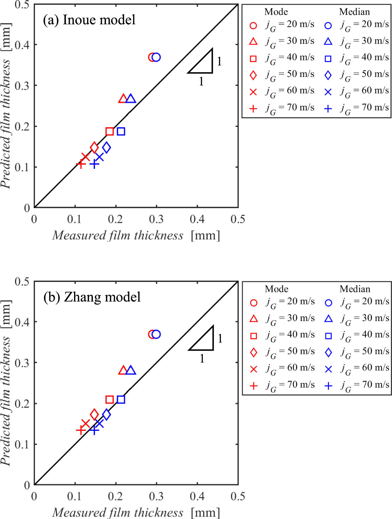 Comparison of the characteristic measured film thicknesses with predictions from the corresponding analytical model. This graph is a re-plotted version of Fig. 20, and compares the mode and median values of all measured film thicknesses with the predicted values of the Inoue model and Zhang model, respectively. Notably, the mode and median of film thickness decrease as jG increases