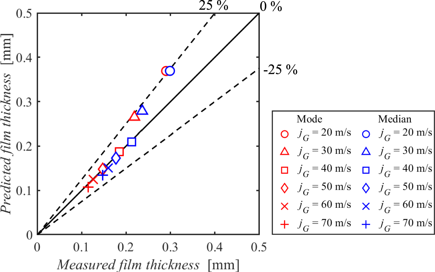 Comparison of the measured film thicknesses with those predicted by the analytical models. Notably, the mode and median of film thickness decrease as jG increases
