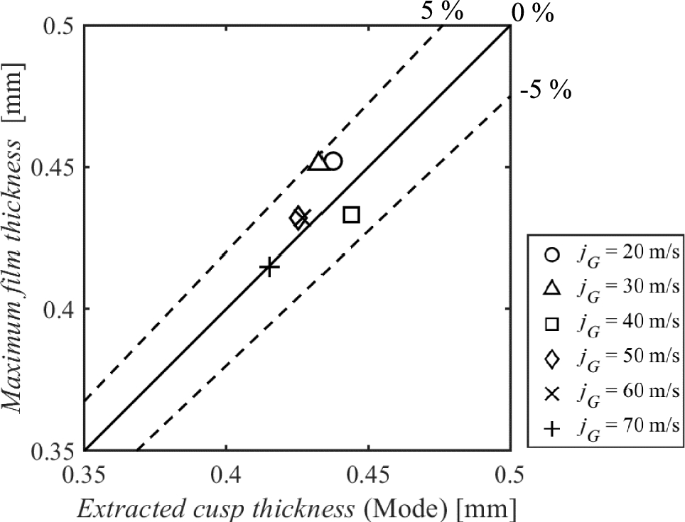 Further, we evaluate the cusp thicknesses extracted using the new algorithm. Figure 22 compares the dominant mode values of the extracted cusp thickness distribution in Fig. 18 with the maximum film thickness defined by Fukano and Furukawa (1998) and Hazuku et al. (2008). This maximum film thickness represents the wave thickness of the liquid film calculated from the 99% cumulative probability of the thickness distribution in Fig. 17. These independently obtained values result in very good agreement with each other. In this context, the cusp thickness in complex interface structures is certainly extracted only by identifying the CP signal, without the conventional maximum film thickness identification method requiring a large record length.