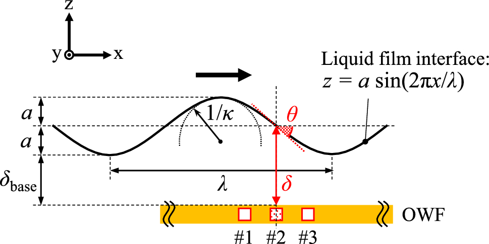 Assuming that a represents half of the wave height H (where H is defined as the difference between the maximum film thickness and base film thickness), the unknown parameters a, κ, and δbase in Eqs. (14) and (15) can be substituted with the experimental conditions in Table 2 or conventional measurement data (Chang et al. 2019, 2023).