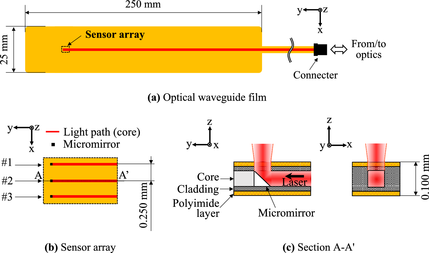 Figure 2 is a structural schematic of the OWF used in this study. The OWF allows light to propagate by connecting the connector to the optics, as seen in Fig. 2a. A close-up view of the sensor group is also provided in the figure. The sensor array consists of three channels located at a pitch of 0.25 mm in a row. We defined channel numbers #1, #2, and #3. The cross-sectional view of a single channel (Fig. 2c) shows that each channel consists of a core layer, a cladding layer, and a polyimide layer, with a micromirror at the core end. Micromirrors were used as sensors in the channels. The OWF is 0.1 mm thick, and the core is square with a 42-μm side length. Since the refractive index of the core is slightly higher than that of the cladding, the light causes total reflection at the core–cladding interface and propagates in the core. At the core end, a micromirror reflects the propagating light vertically and passes it through the OWF’s surface.