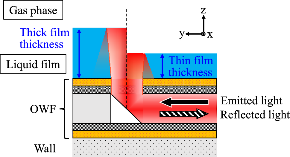 We developed a method for measuring liquid film thickness using an optical waveguide film (OWF) (Miyachi et al. 2022; Furuichi et al. 2023a,b). The OWF is a flexible polyimide film with several built-in optical waveguides. It is easily installed on a channel wall, such as inside a circular tube or another curved surface. This method is based on a simple but robust measurement principle that uses the light intensity reflected by the surface of a liquid film in a manner similar to that used in the fiber-optic method. The optical response of the OWF depends on the refractive index difference between the gas and liquid phases, and the refractive index of water has a very small temperature dependence (Schiebener et al. 1990). Therefore, the OWF method is expected to be applicable to the aforementioned industrial processes. Table 1 summarizes the measurement limitations of typical techniques for measuring film thickness, including the OWF method. Our OWF sensors can be designed in sizes ranging tens of micrometers, enabling high spatial resolution. The time resolution of the OWF method depends on the photoelectric conversion systems, thus making it possible to achieve sampling rates of over a few hundred kHz at a relatively low cost. Moreover, the OWF method is highly responsive to thin films (typically < 100 μm), whereas earlier methods tend to be less responsive to such thin films. Therefore, OWF has the potential to enable the detection of instantaneous thickness fluctuations more accurately than conventional methods. The effectiveness of liquid film measurements via the OWF in annular flow was verified experimentally and numerically (Furuichi et al. 2023a,b).