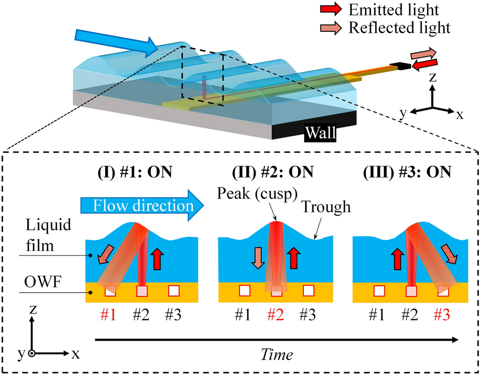 We introduce a new method for simultaneously detecting a film’s thickness and the shape of an interfacial wave by array sensing. Figure 5 illustrates the concept: channel #2 functions as an Active Ch, emitting light and receiving reflected light from the liquid film’s interface, whereas channels #1 and #3 each function as Passive Ch, receiving only the reflected light. These sensors are aligned in the direction of the liquid film flow. The figure in the frame is a cross-sectional view of the OWF sensor section, showing the peaks of the interfacial wave, i.e., the wave cusps, passing over the sensors in the order of times (I), (II), and (III). In this case, the internal reflection is detected in the order of channels #1, #2, and #3 due to the geometrical optics relationship. Channel #2 detects all wave extrema (i.e., the wave’s cusps and troughs) and measures the film thickness using the calibration curve (Fig. 4). Thanks to the small sensor size, the reflected light intensity of waves with an interfacial curvature of less than 5.0 mm-1 is consistent with that of a flat film surface (Furuichi et al. 2023b). Therefore, the uncertainty in the measured thickness caused by the shape topology of the interface is negligible for almost all waves arising on the liquid film (Chang et al. 2019). In contrast, channels #1 and #3 are turned on only when the cusps pass over the sensor array. Therefore, we can directly measure the cusp thickness by extracting the intensity of the channel #2 signal when the signals from channels #1 and #3 appear clearly. Hereafter, we refer to this meaningful peak in #1 and #3 as a cusp passage signal (CP signal).