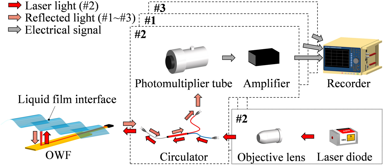 Figure 6 is a schematic of the optics in the measurement system using the OWF. A laser diode (cat. no. OBIS637LX, Coherent Corp., Saxonburg, PA, USA) was connected only to channel #2, and the laser beam was guided through an objective lens (cat. no. 101-40S6, Yashima Optical Co., Tokyo, Japan) into an optical circulator and OWF. The reflected light on the liquid film interface was received by the core of the OWF and traveled in the opposite direction in the optical circulator (model WMC1H1F, Thorlabs, Newton, NJ, USA). The reflected light was converted into an electrical signal by a photomultiplier tube (cat. no. R928, Hamamatsu Photonics, Hamamatsu, Japan) and recorded as the output voltage by a recorder (#8861-50, Hioki, Nagano, Japan) through an amplifier (cat. no. C7319, Hamamatsu Photonics). This method requires a series of measurement systems for each channel.