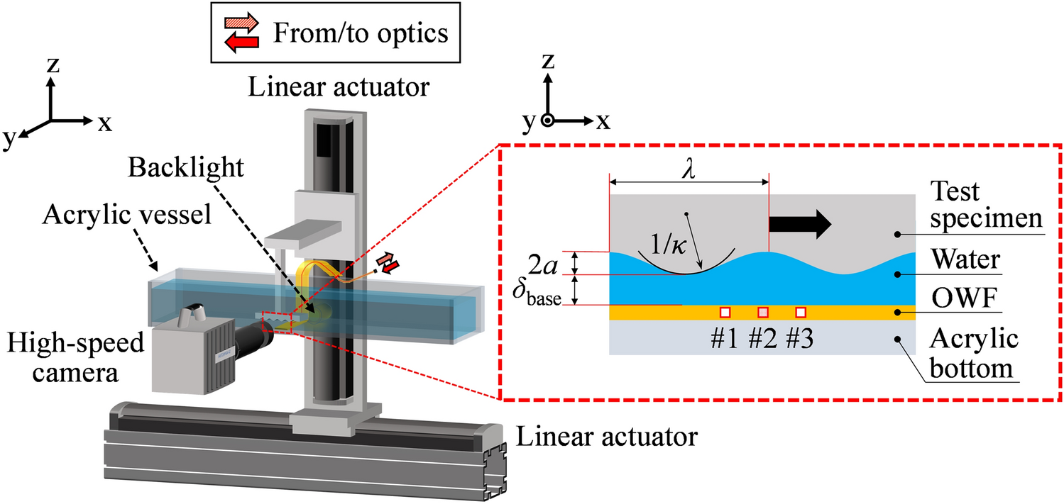 In this experiment, we investigated the characteristics of the CP signal using the solid–liquid interface. Figure 7 is a schematic of the experimental apparatus. We used a test specimen made of stainless steel with a sinusoidal wave shape because it is difficult to experimentally simulate arbitrary wave shapes with a gas–liquid interface. The surface of the specimen was mirror-polished. The OWF was fixed to the bottom of an acrylic vessel filled with ultrapure water. Table 2 lists the experimental conditions for the test specimen. The specimen was installed such that the smallest distance δbase from the OWF surface to the specimen was 0.2 mm. The specimen parameters were as follows: amplitude a of 75 μm, wavelength λ of 1.08 mm, and curvature κ of 2.53 mm−1. We set these conditions based on a report on liquid film flow on a flat plate (Chang et al. 2019, 2023).