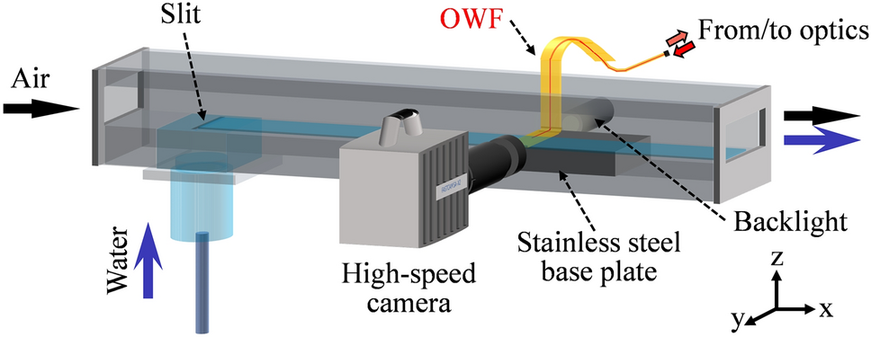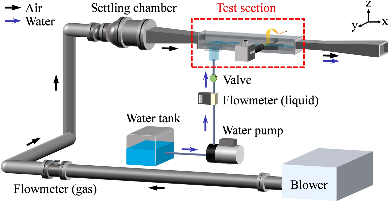 Overview of the experimental apparatus for the true film flow measurement. Airflow is introduced from the wind tunnel, which is accompanied by water in the test section, resulting in the formation of a wavy liquid film flow. At the downstream end of the test section, the flows are released into the atmosphere