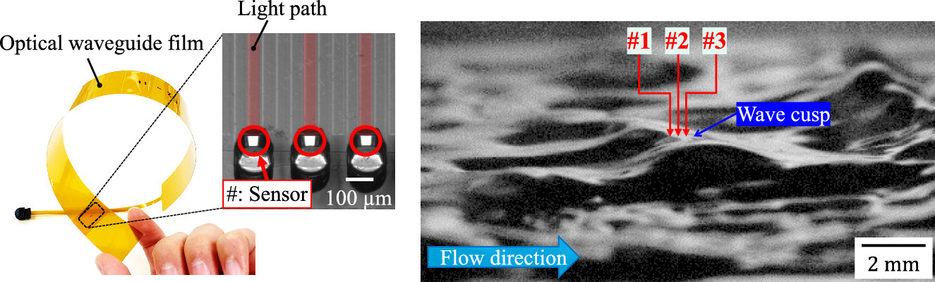 A significant advantage of the OWF is its high degree of flexibility in production thanks to the photo-printing technique (Mori et al. 2010), allowing the sensor number, sensor position, and waveguide shape to obtain broad spatial distributions of the liquid film profiles. Additionally, the surface layer of the OWF is a polyimide, which can easily dope ionic substances to arrange its surface wettability if needed. The OWF specifications in this study, i.e., the sensor pitch and untreated surface, were determined to directly measure the cusp thickness of disturbance waves in an air–water two-phase system using the minimum necessary processes.
