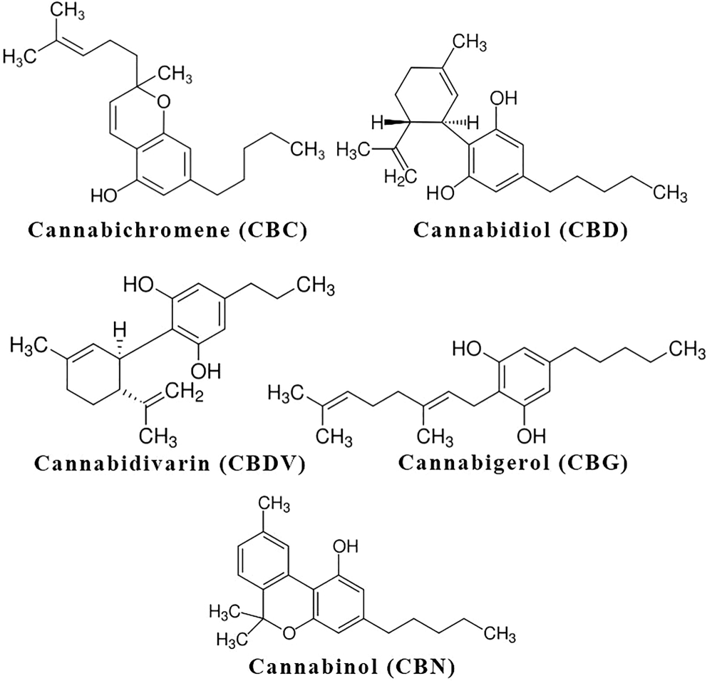 Chemical structure of the investigated neutral phytocannabinoids cannabichromene, cannabidiol, cannabidivarin, cannabigerol, and cannabinol