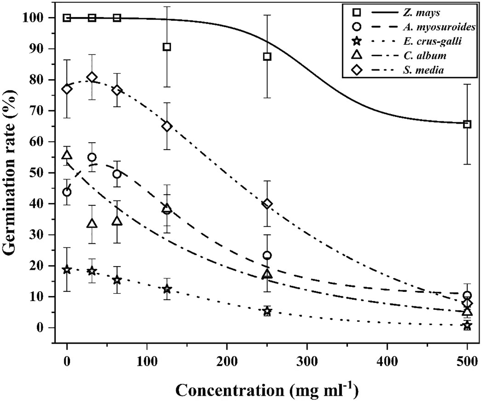 A significantly reduced germination rate of Z. mays was measured solely through the application of HE in the highest concentration (500 mg ml−1) compared to the control (Fig. 3).