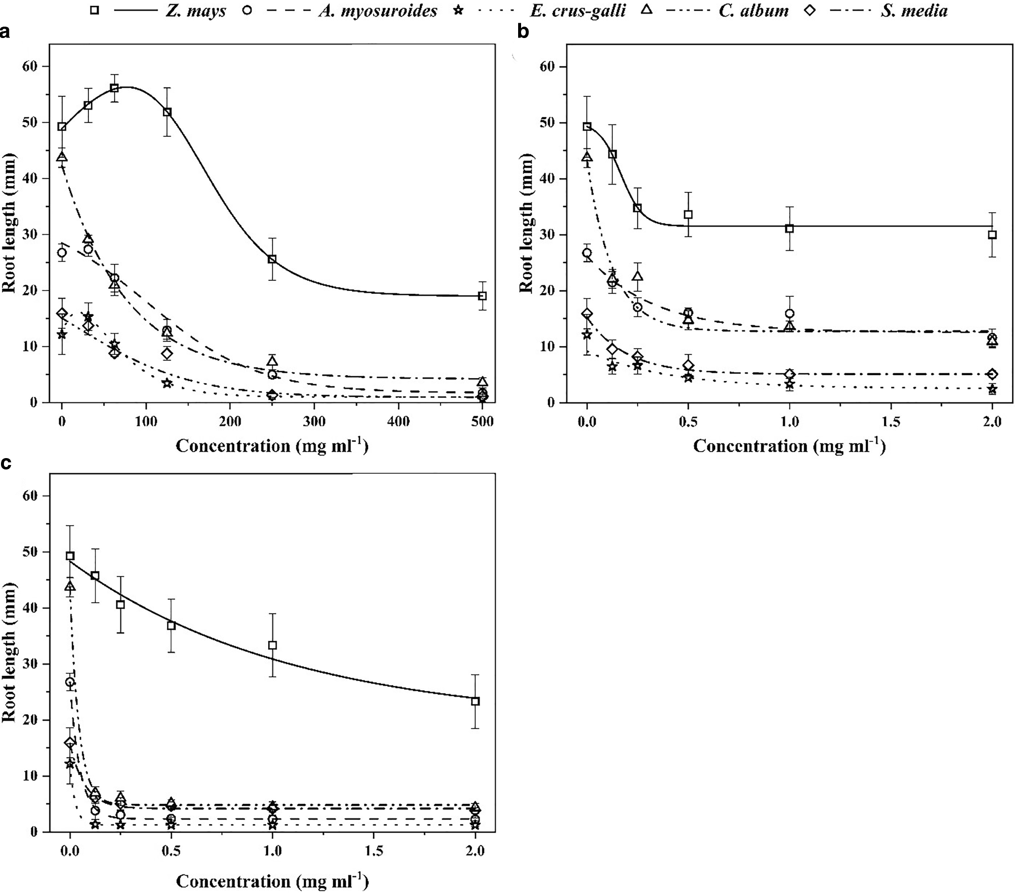 Dose-response diagram showing the mean root length (mm) of Zeamays, Alopecurusmyosuroides, Echinochloacrus-galli, Chenopodiumalbum and Stellaria media with standard deviation in relation to the applied six aqueous Cannabissativa tissue extract (HE) (a) concentrations ranging from 0 mg ml−1–500 mg ml−1 and six cannabidiol (CBD) (b) and cannabidivarin (CBDV) (c) concentrations ranging from 0 mg ml−1–2 mg ml−1 10 days after the application. For the non-linear regressions, the log-logistic growth model of Streibig (1980) and for hormesis the modified one of Brain and Cousens (1989) were used. Means of the germination rate were proofed for significant differences using the TukeyHSD post hoc test (p < 0.05)