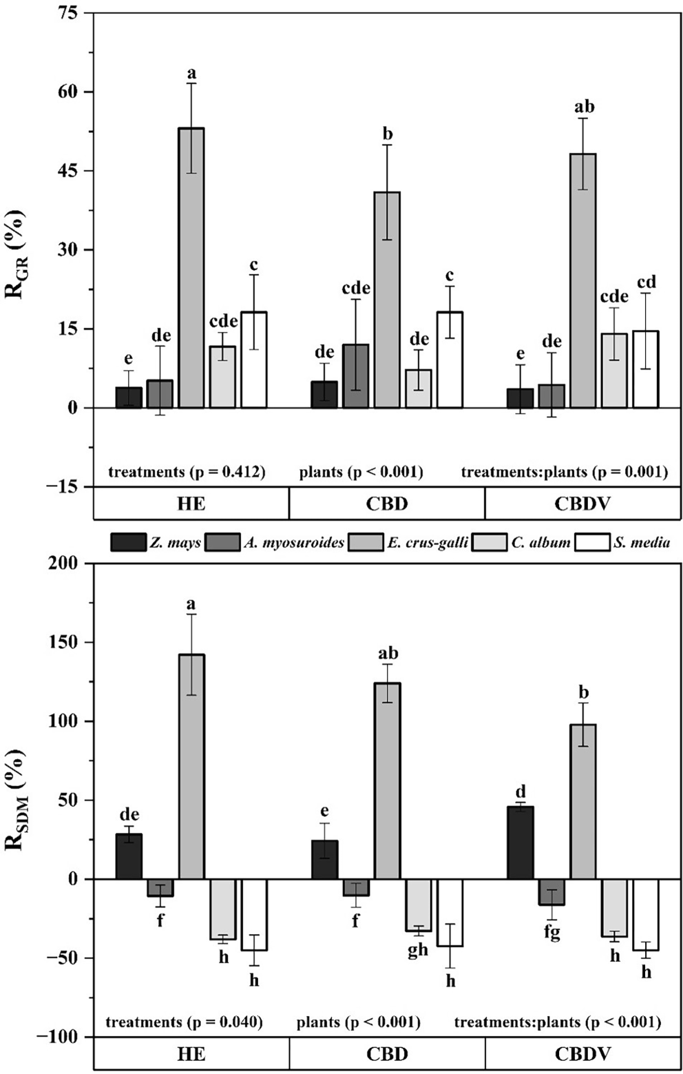 Pre-emergence application of CBD, CBDV, and HE at the highest concentration resulted in increased germination and shoot dry matter with a positive RGR and RSDM (Fig. 5). The application of CBDV resulted in a 1.9 times significantly higher RSDM in Z. mays than the application of CBD and HE (Fig. 5).