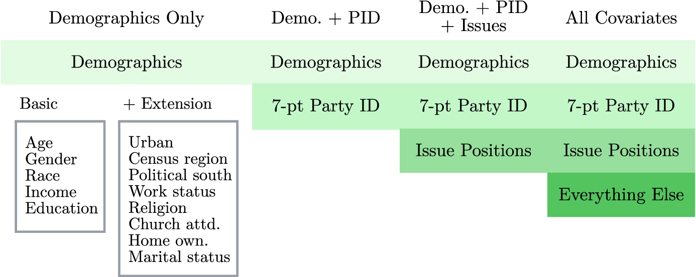 To further investigate the extent to which vote choice is inferrable based on voters’ observable characteristics, we use four nested variable specifications for the analysis. Figure 1 shows the labels of each specification and the variables included. Given that the survey questionnaires reflect the issue cleavages of the day, such as the Iraq war or the Affordable Care Act, the third and the fourth specifications will usually consist of imperfectly overlapping sets of variables for each wave. We include these specifications for benchmark purposes.