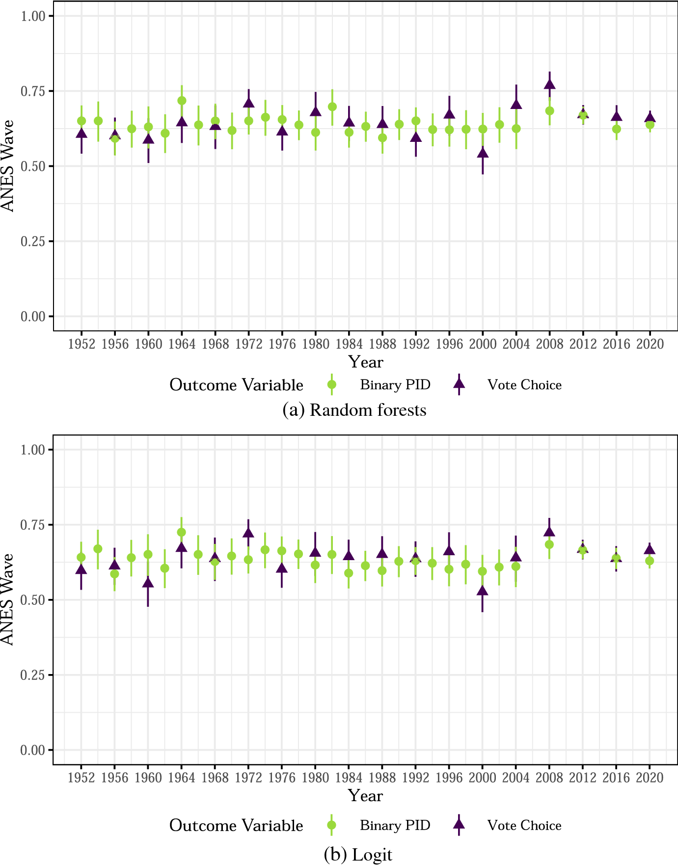 Note that AUC (in Appendix), over time, seems to be increasing for vote choice unlike accuracy. The slope is 0.0019 with a standard error of 0.0005 (p-value < 0.01), hinting that over all possible threshold values, the ability to separate two-party vote choices has increased over time. But when classifying vote choices, researchers rarely use a threshold other than 50%, so we present accuracy as our main results. Similarly, for binary PID, the slope is 0.0019 with a standard error of 0.0004 (p-value < 0.01).