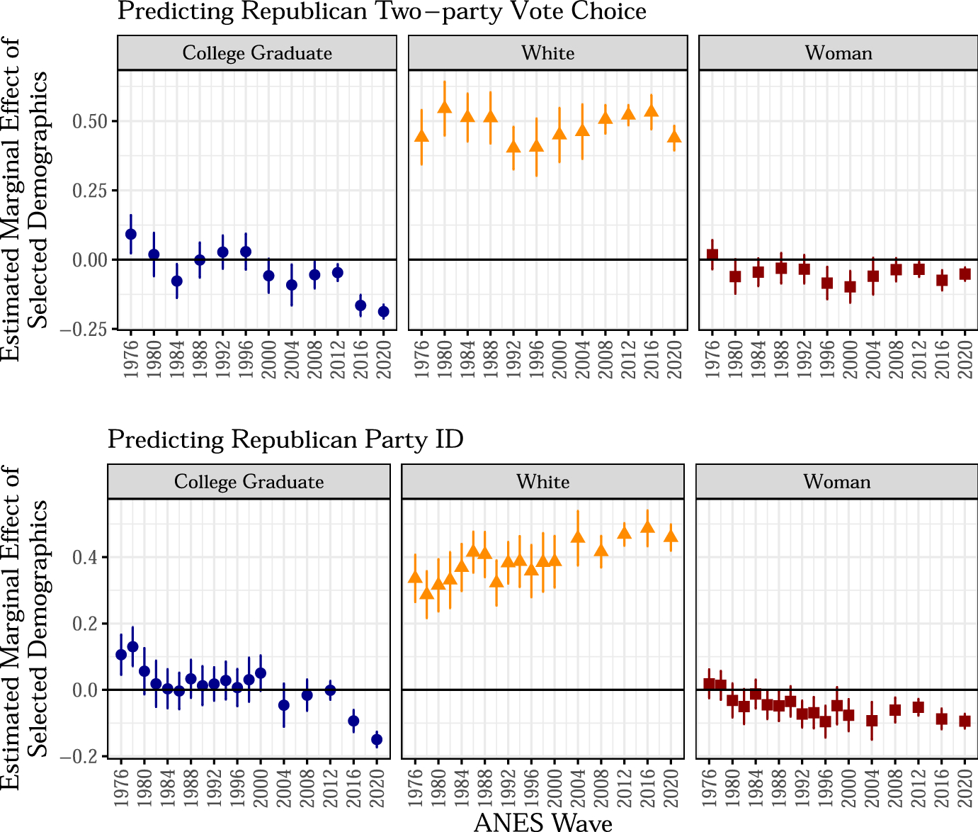 Understanding whether political choices and identities are closely linked to voters’ observable characteristics is important for both theoretical and practical reasons. Theoretically, whether a readily perceivable demographic group is a reliable political base or a swing voting bloc has substantial implications for representation (Lazarsfeld et al., 1944; Panagopoulos, 2015, 2017, 2020). Moreover, if group identities tied to partisanship intensify, group divisions will increase, fueling affective polarization (Levendusky, 2018). Practically, candidates want to know to what extent any constituency might be persuadable (Axelrod, 1972; Fenno, 1978; Hersh, 2015).