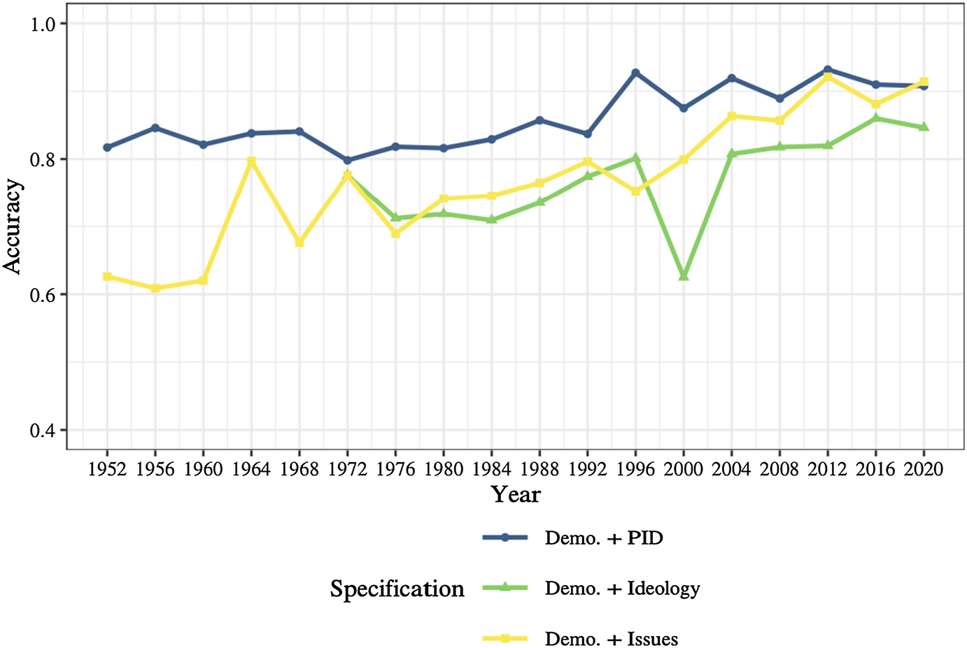 We also note that predictions based on partisanship and demographics can further be improved by incorporating data on respondents’ issue positions. Adding extra variables (including non-policy features such as voters’ political knowledge, attitudes tapping into identity considerations, and other survey instruments) to the set of model features also generally yields higher accuracy. However, once partisanship has been accounted for, the added value from additional variables is decreasing over time. In recent years, there has been only minimal gain from richer specifications once partisanship and demographics are accounted for.