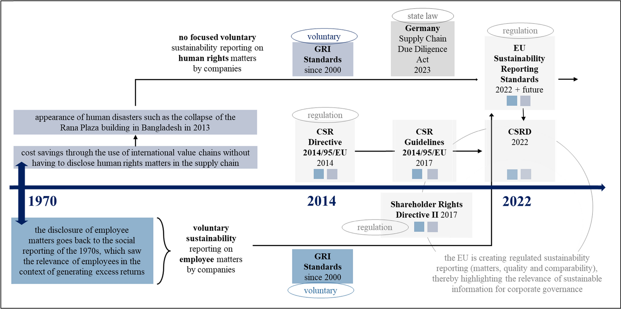 Human rights matters. Human rights matters gain relevance when a company outsources employment to external supply chains. While the company may realize cost benefits or improved access, outsourcing employment to external organizations may create several risks, including negative effects on employee morale (Belcourt 2006). In contrast to employee matters, a company outsourcing employment has fewer opportunities to directly influence human rights matters. A focus on human rights matters (e.g., external workforce/supply chain) is particularly important in the prevention of human rights violations (EU Directive 2014). Only recently has the regulation of human rights matters in global supply chains gained attention. This development stems from the inhumane working conditions (ILO 2017) to which many employees are exposed despite internationally recognized protections (ILO 1999; UN 2011). Comprehensive worker rights and protections are now widely recognized (Nolan 2017; Venkatesan 2019), which has resulted in a reduction in exploitation, such as child labour, debt bondage and forced labour (Barrientos 2013; Caruana et al. 2020; Davies 2019). This movement has given rise to numerous national laws (Saha et al. 2024), such as the US Dodd–Frank Act (United States Congress 2010), the Australian Commonwealth Modern Slavery Act (Australian Government 2019) and the German Supply Chain Due Diligence Act (Bundestag 2021). At the European level, the EU Commission updated its trade and investment strategy to promote ethical trading systems (EU Commission 2015) and adopted a supply chain law with the Corporate Sustainability Due Diligence Directive in 2024 (EU Commission 2022; EU Commission 2024). Furthermore, mandatory sustainability reporting in the EU includes disclosure requirements regarding human rights matters (EU Commission 2023a; EU Directive 2014). Additionally, the introduction of the double materiality approach by the CSRD may enhance the degree of disclosure regarding human rights matters by companies that did not previously focus on the materiality approach (Correa-Mejía et al. 2024). Table 1 summarizes the development of disclosure requirements regarding employee and human rights concerns in the EU.