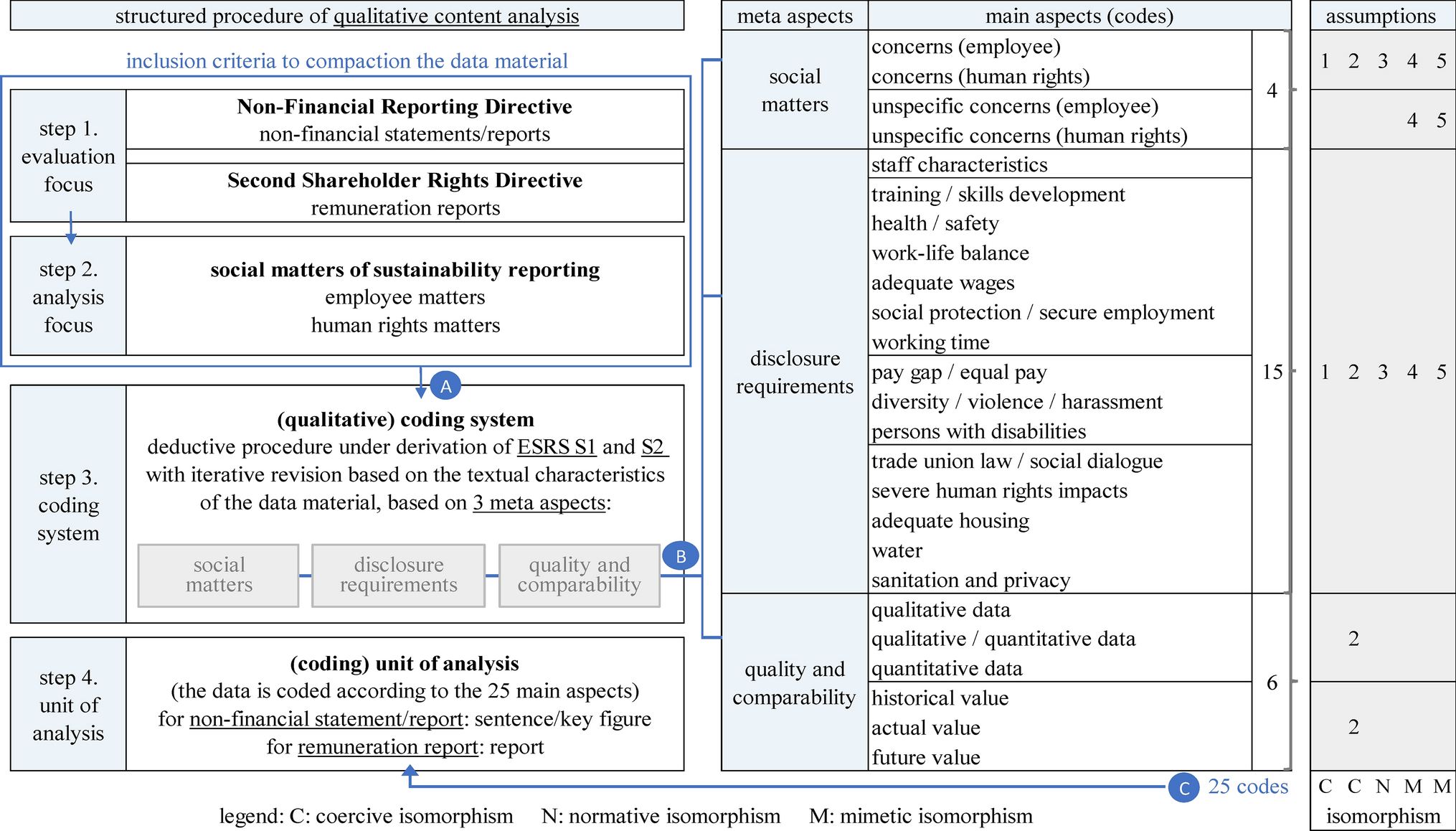 To meet the challenges of qualitative content analysis (Landrum and Ohsowski 2018; Vourvachis and Woodward 2015) regarding validity, systematics, and regularity, the analysis was based on a structured process (Berniak-Woźny and Kwasek 2020). Atlas.ti software established for qualitative evaluations has been used for the analysis (Aureli 2017; Ploum et al. 2019). The process steps are presented in the following explanations in conjunction with Fig. 3, Table 2 and the complete overview of the coding in the Appendix. Step 1 (evaluation focus: Fig. 3): Only mandatory elements of sustainability reporting (non-financial statement/report; remuneration report) were coded by considering all disclosure formats. This approach, which is common among researchers (Korca et al. 2021; Zarzycka and Krasodomska 2022), allows for a standardized analysis. Step 2 (analysis focus: Fig. 3): The analysis of two related social reporting matters enabled a qualitative comparative assessment (Ragin 1999) of the matters and expanded the understanding of differences in corporate social reporting. Following the selection of the case (chapter 4) the qualitative comparative assessment contains the three major steps (Ragin 1999) testing the causal conditions and presentation of the results (chapter 5) as well as interpretation of the results (chapter 6 and 7). In this way, the study extended the existing state of research on social sustainability reporting (Di Vaio et al. 2020; Lopatta et al. 2023; Samani et al. 2023) through insights into the reporting of employee matters and human rights matters. Step 3 (coding system: Table 2 and Appendix): A deductive approach is used for the analysis, in which the aspects to be examined (meta-aspects) and codes (main aspects) are determined from a normative derivation (Boiral et al. 2019). For this, a direct link between the reporting requirements (CSRD ESRS S1/S2; Second Shareholder Rights Directive) and the corporate disclosure (non-financial statement/report; remuneration report) was essential (Aureli 2017). Based on this, an iterative revision of the codes followed, in which they were adapted to the data material through new formation, condensation, and expansion (Hsieh and Shannon 2005; Mayring 2014). As a result, 25 codes were derived for coding the non-financial statement/report; remuneration report: 4 codes for social matters; 15 codes for disclosure requirements and 6 codes for quality and comparability. Step 4 (unit of analysis: Fig. 3): For the coding of employee matters and human rights matters in the non-financial statement/report, the smallest unit of analysis (one sentence/one key figure) was selected to achieve the exact results (Romero et al. 2019). For this purpose, all codes about which the sentence/figure provided information were appended to the coding – e.g. the sentences “The Lost-Time Injury Frequency (LTIF) indicator measures work-related accidents per million hours worked that result in lost time.” disclosed on employee matters were coded with 3 codes (specific concerns (employee); health/safety; qualitative data) and “The LTIF for employees deteriorated to 2.1 (2020: 1.5).” with 5 codes (specific concerns (employee); health/safety; qualitative/quantitative data; historical value; actual value). In addition, nonspecific disclosures (not covered by ESRS S1/S2), such as the sentence disclosed in a report “We are convinced that listening to our employees is crucial to creating a first-class employee experience and to recruiting and retaining the best talent.” were coded as nonspecific disclosures. This coding enabled an evaluation according to specific and nonspecific disclosures and thus an overall evaluation of the non-financial statements/reports disclosed by the companies. For the coding of employee-related remuneration targets and human rights-related remuneration targets, the remuneration report was selected as the unit of analysis. Each target reported on one of the matters was coded.