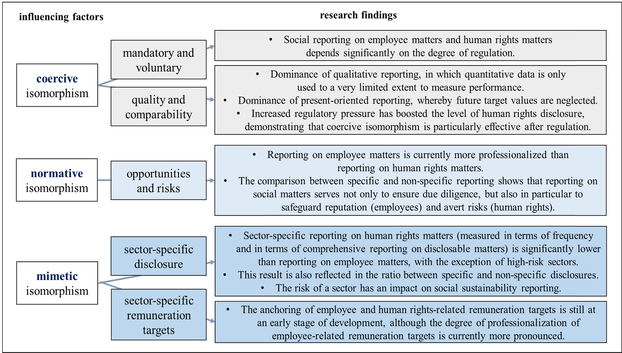 To enhance the degree of comparability and reporting quality of employee matters and human rights matters, coercive isomorphism plays a crucial role by contributing to the degree of standardization of sustainability reporting processes. Based on the reporting obligations of the NFRD, the European legislator passed the Corporate Sustainability Reporting Directive (CSRD) by the end of 2022. Additionally, for the first time, European Sustainability Reporting Standards (ESRS) have been developed, which have to be used to publish a sustainability report in line with the CSRD. Thus, in line with coercive isomorphism and the research results, it may be assumed that CSRD as a form of mandatory sustainability reporting (Carungo et al. 2021) and by establishing mandatory sustainability standards (Stawinoga and Velte 2022) in the form of ESRS will increase the quality of employee matters and human rights matters over time.