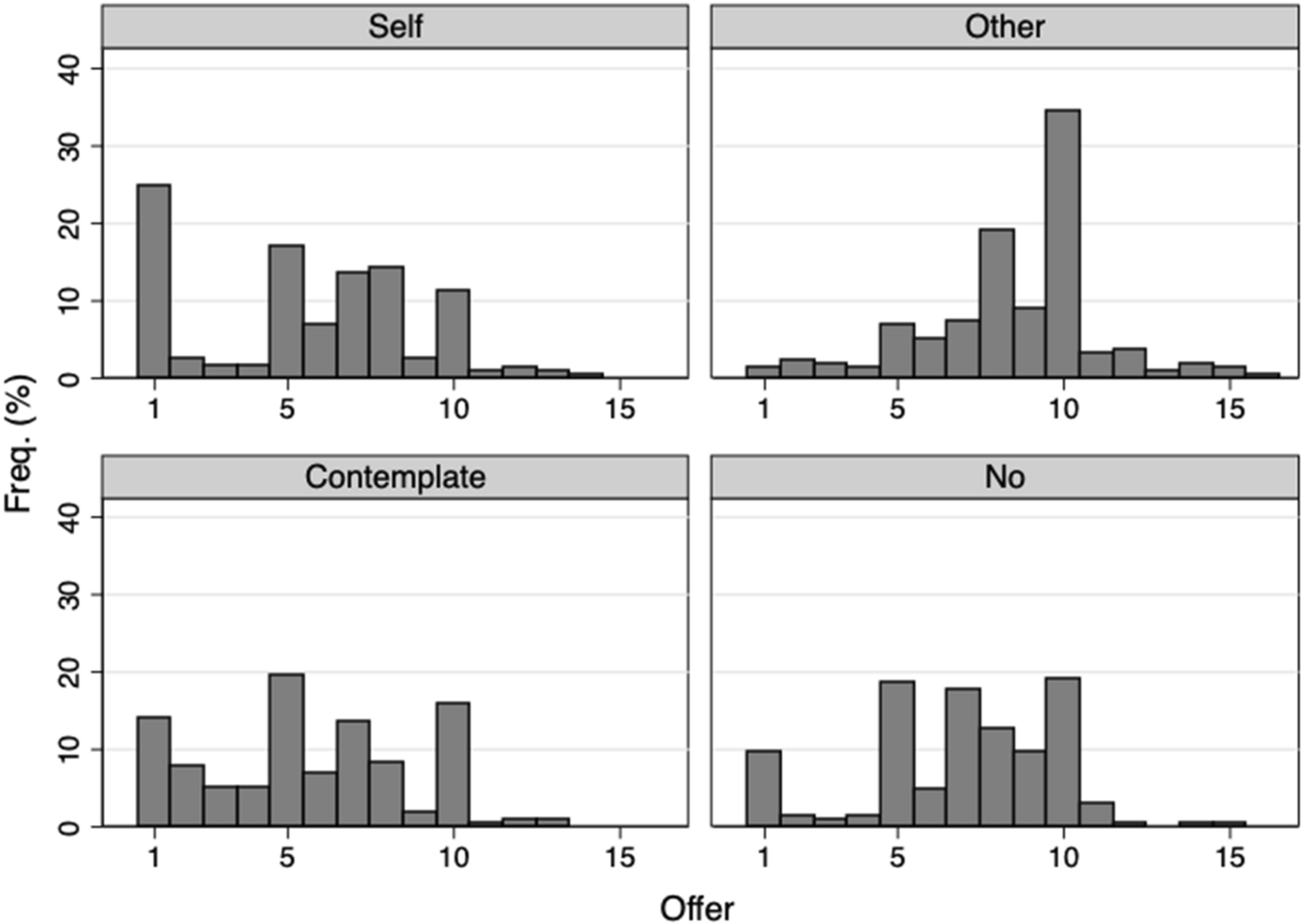 Figure 2 shows the distribution of offers for each condition and provides some information on how the treatment effects shown in Fig. 1 came about. In line with higher average offers in the condition with the other-focused phrase, Fig. 2 shows that offers of 10 or more points are most frequent in Other, where the equal-split is the modal offer (35% of all offers). A logistic regression demonstrates that proposers were significantly more likely to offer 10 or more points in Other (46%) than in Self (15%), Contemplate (18%), and No (23%; p = 0.006, 0.014, and 0.019, respectively), while the likelihood of such generous offers does not differ significantly between Self, Contemplate, and No (Table 2, Model E in Appendix A). Proposers’ tendency towards making intermediate offers—offers of 6 to 9 points—did not vary significantly between conditions (Table 2, Model D). However, aside from inducing proposers to make very generous offers, other-focused self-talk also inhibited proposers from making very low offers. While minimum offers of just 1 point make up only 1% of the offers by proposers in Other, minimum offers make up 10% and 14% in No and Contemplate, respectively, and minimum offers were even the modal offer in Self, accounting for 25% of the offers. A logistic regression shows that proposers were significantly less likely to offer just 1 point in Other than in Self (p = 0.004) and Contemplate (p = 0.034; Table 2, Model B). More generally, proposers in Other were less inclined to make low offers—offers of 5 or less points—compared to proposers in Self, Contemplate, and No (p = 0.001, 0.001, and 0.041), while the proposers’ propensity to make low offers did not vary significantly between the latter conditions (Appendix A, Table 2, Model C). In sum, these observations suggest that the use of the other-focused phrase leads to higher average offers because it inhibits very low offers and promotes very generous offers. In addition, the tendency for average offers to be lowest in Self appears to be because the self-focused phrase leads many proposers to offer only 1 point.