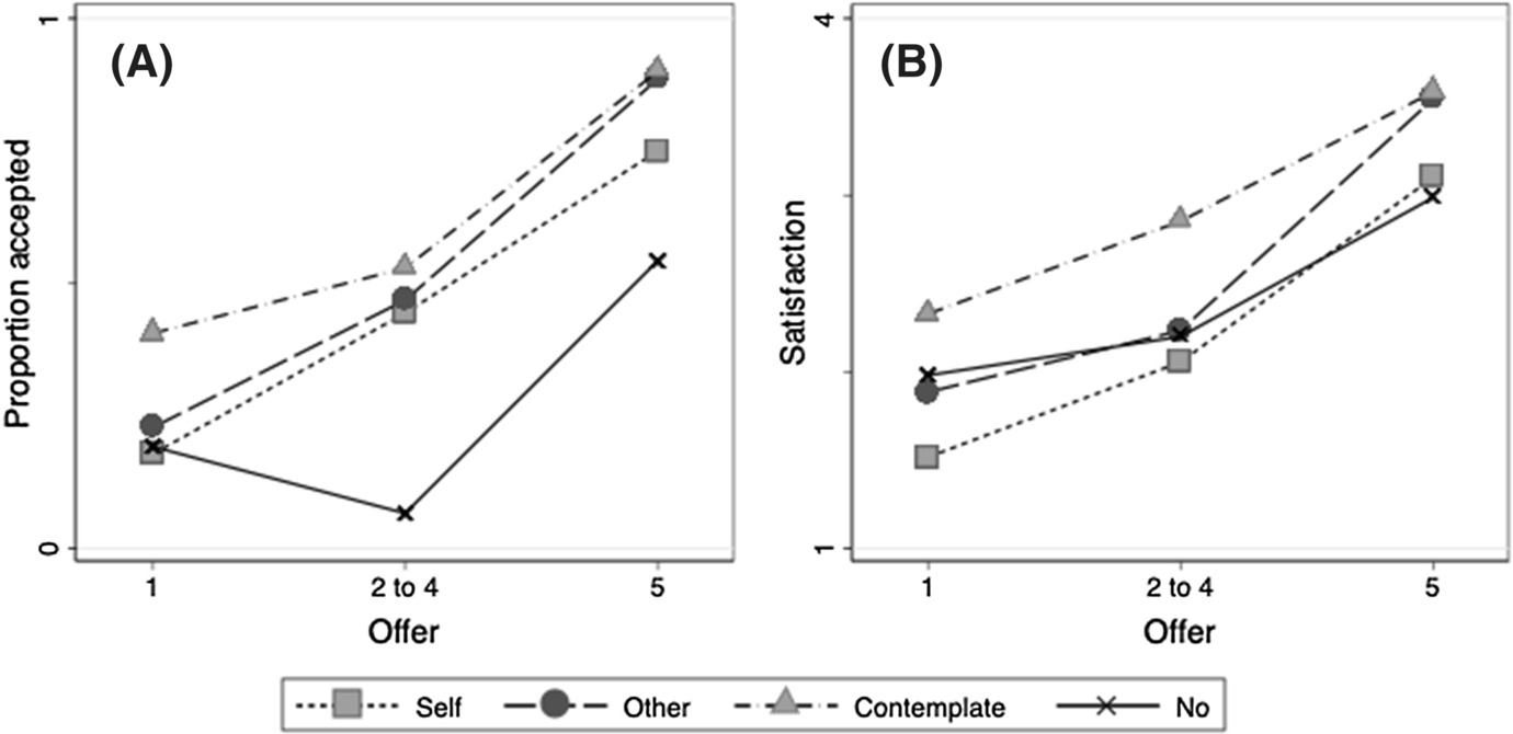 Figure 3B shows how the responders’ level of satisfaction with low offers varied across the self-talk conditions. After making their decision, responders indicated their satisfaction with (i) the offer and (ii) the proposer on 7-point scales. Because we find no systematic differences in the two aspects of satisfaction we focus on “(average) satisfaction”. Responders’ satisfaction increased with the number of points offered. Furthermore, responders tended to be least satisfied with low offers in the condition with the self-focused phrase while they were most satisfied in the condition with the contemplation-inducing phrase (Fig. 3B and Appendix A, Table 4). The difference in satisfaction between Self and Contemplate is statistically significant (p = 0.025), while none of the other differences in satisfaction between self-talk conditions is significant (Appendix A, Table 4).