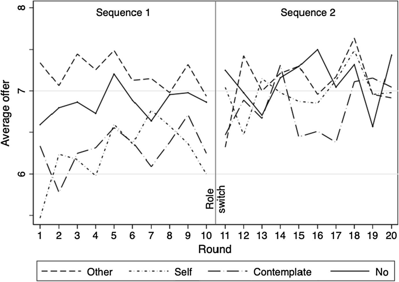 Another issue that is relevant in the interpretation of the results is how the imposed waiting time affects decisions. All participants in the self-talk conditions had to wait at least six seconds before they could enter their decision (which offer to make for proposers and whether to accept the offer for responders) while participants in the no self-talk condition could make their decision immediately. This factor may thus have influenced the results, as previous studies (Cappelletti et al. 2011; Cardella and Chiu 2012; Grimm and Mengel 2011; Oechssler et al. 2008) suggest that forced ‘cooling off’ periods enhance acceptance rates. However, waiting time does not fully explain our results. If the presence of self-talk only affected decisions because of its association with waiting time in our design, we would not expect to see differences between the self-talk conditions. For the proposers, the other-focused self-talk condition clearly has a different effect on offers than the self-focused self-talk condition, the contemplation-inducing self-talk condition and the no self-talk condition. For the responders, we would expect to see higher acceptance rates in the self-focused self-talk condition as compared to the no self-talk condition if waiting time was the primary factor influencing acceptance rate. As this difference is not significant, we suggest that the particular way in which the waiting time is filled (i.e. the specific content of the self-talk) is also of importance in determining acceptance rates. In addition, differences in proposer and responder behavior between the conditions with self-talk and the baseline treatment without self-talk tended to decrease over the rounds of the sessions (see Appendix B). This is to be expected if the differences indeed reflect effects of self-talk and if self-talk effects fade out with repetition.