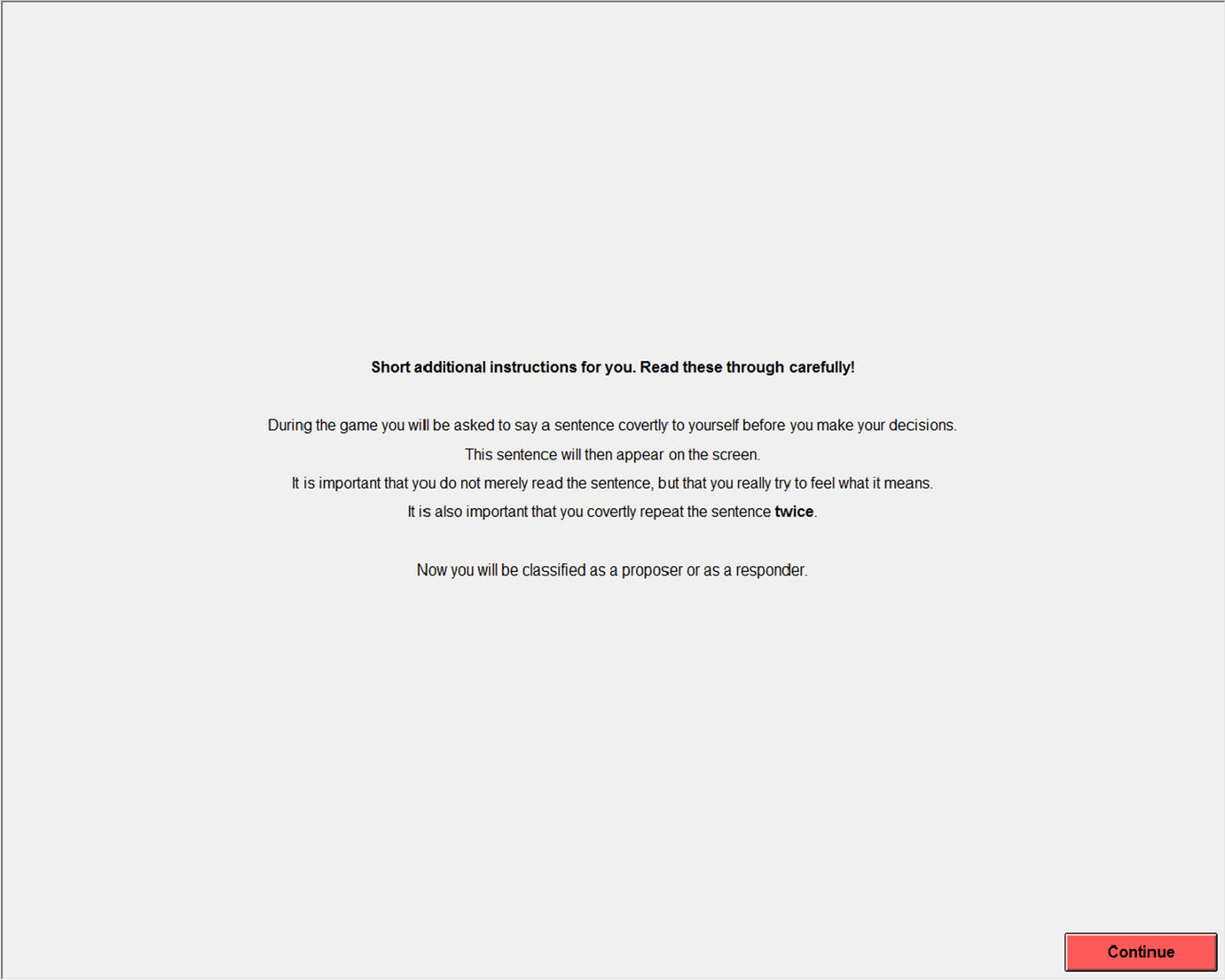 At the beginning of their session, all participants read the same printed instructions (see Appendix C). Then, each participant was assigned a role (proposer or responder) and a self-talk condition. Additional instructions regarding the self-talk manipulation were given on the computer screen exclusively to those assigned to a condition with self-talk. Participants in the self-talk conditions were informed that during the games they were going to play they would be asked to covertly say a phrase to themselves and that they should try to internalize the meaning of this phrase (see Fig. 5 in Appendix C). The instructions were silent about the self-talk condition of the partner.