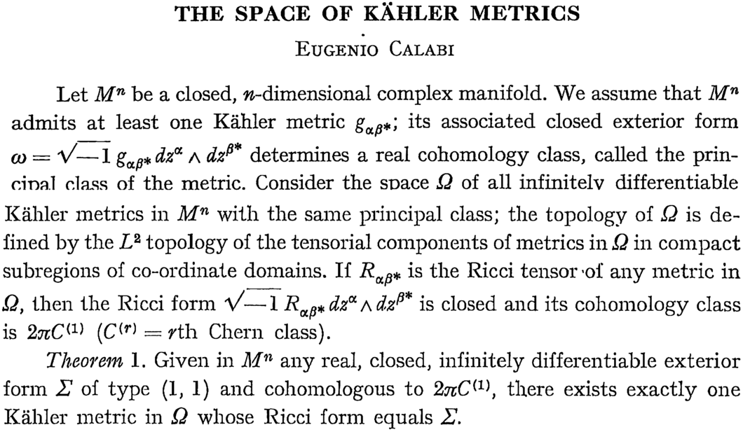 The beginning of a long story: The first lines of Calabi’s abstract for his talk at the ICM 1954 in Amsterdam [2], stating as a theorem what would be named the Calabi conjecture later